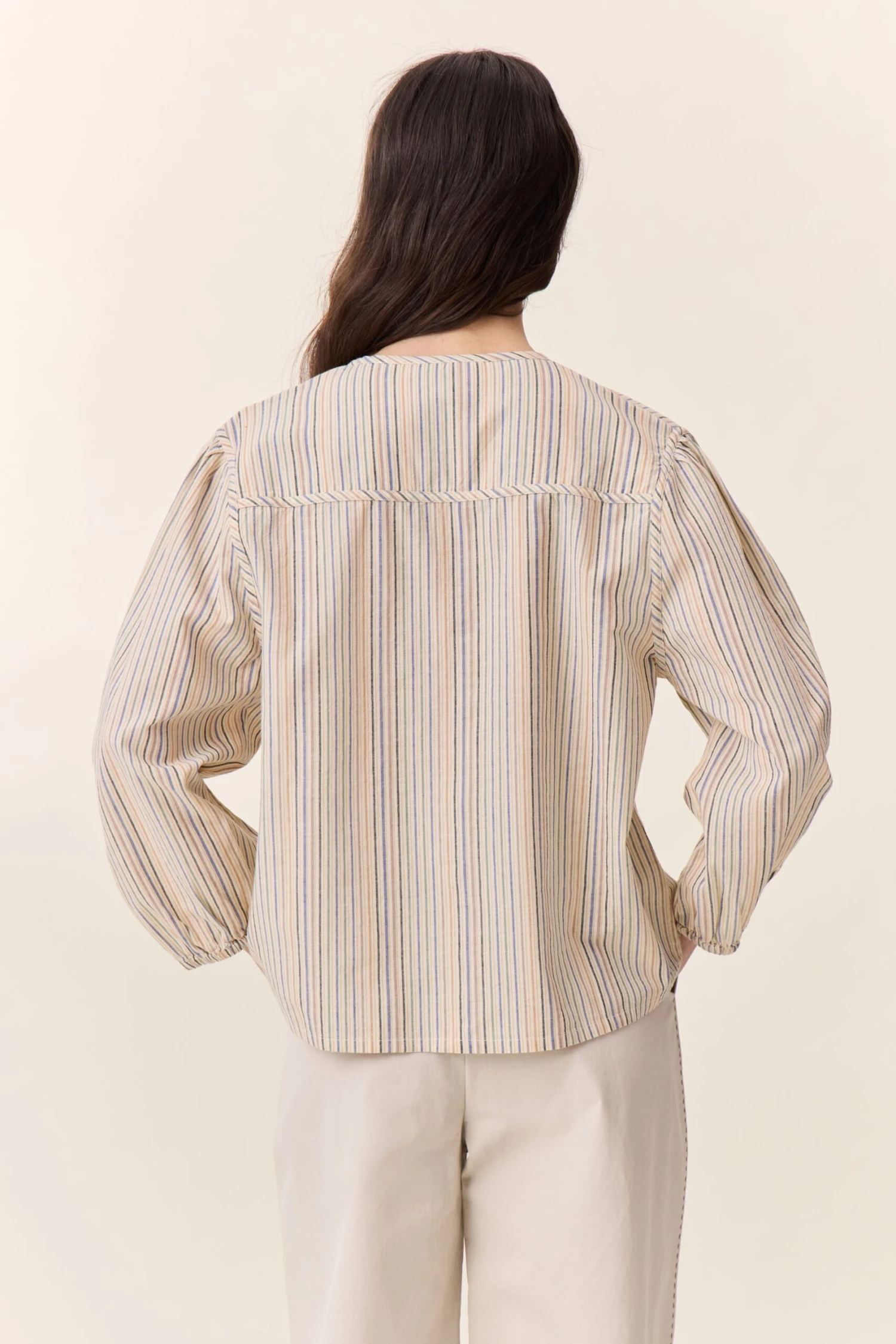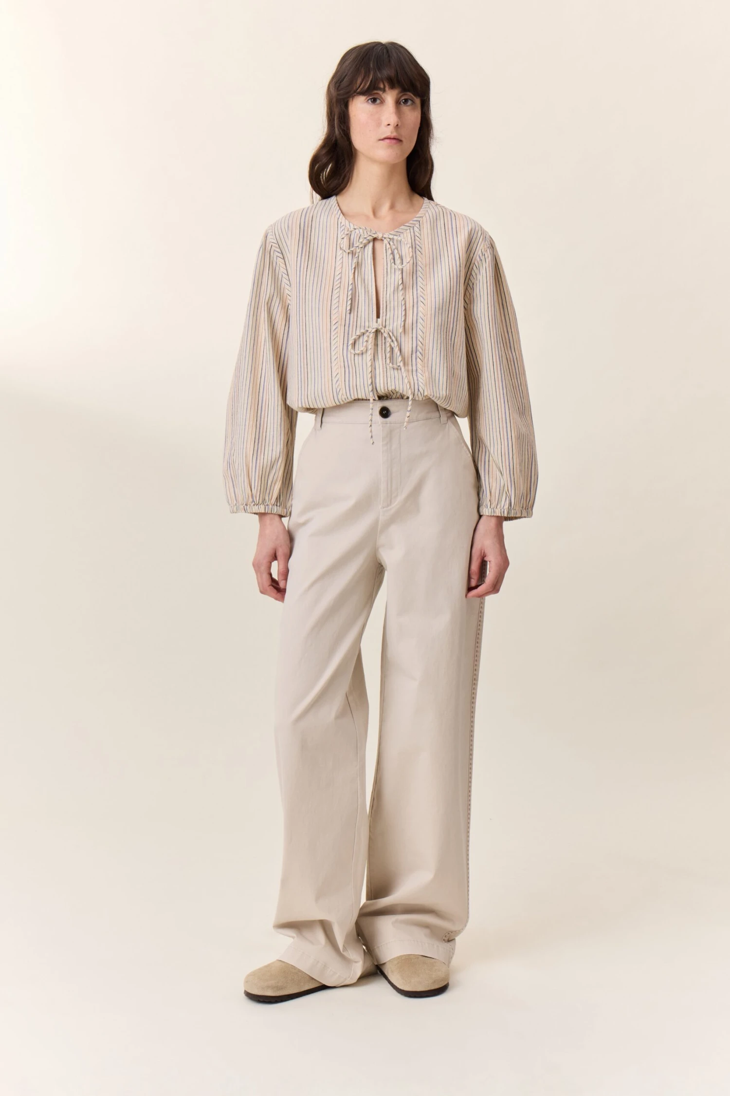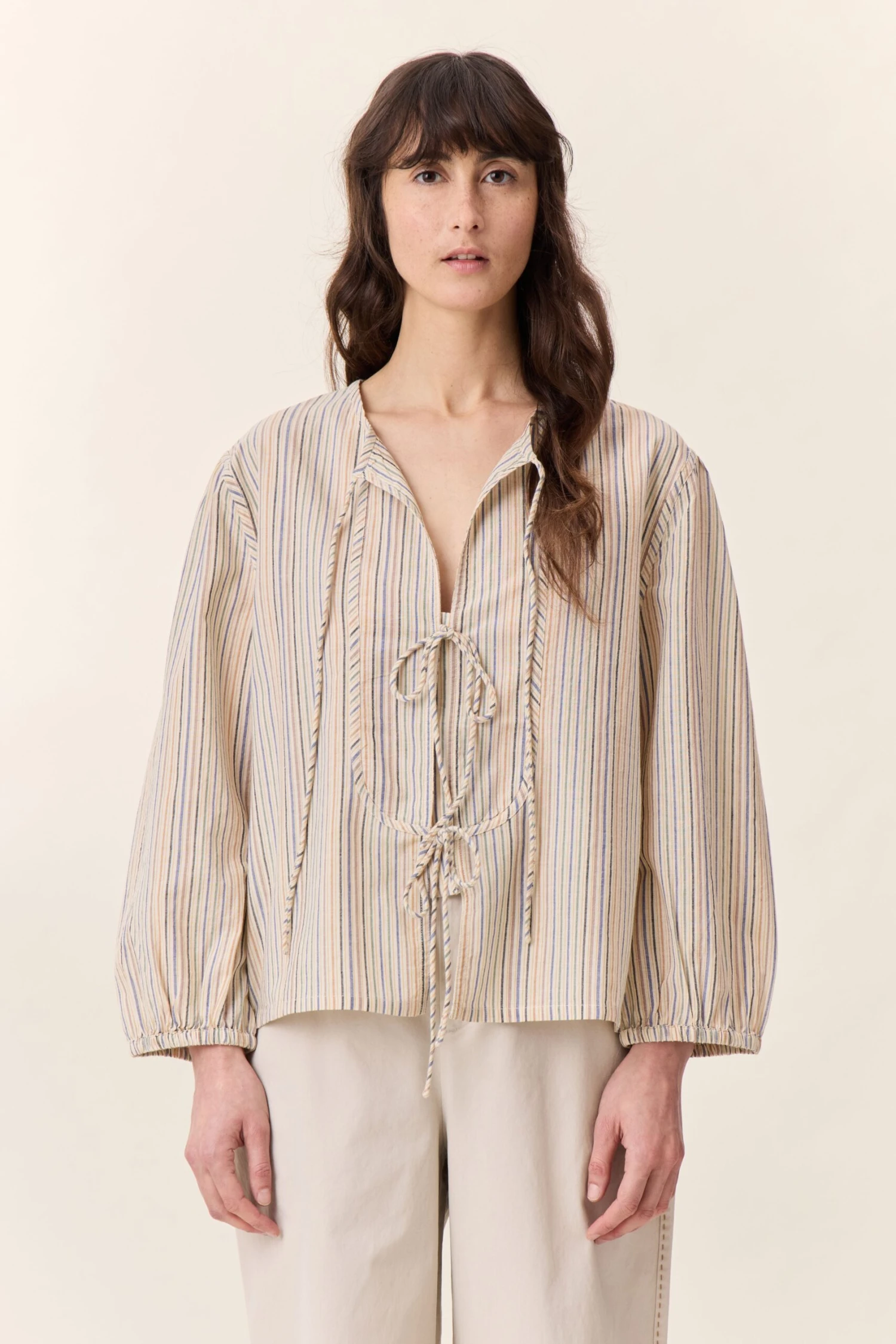 La blouse Carsa Multi séduit par ses détails raffinés et son allure intemporelle. Son délicat imprimé à rayures et ses liens à nouer à l’avant apportent une touche de douceur et de romantisme à la silhouette de la femme Leon & Harper. Une pièce élégante qui allie féminité et confort.