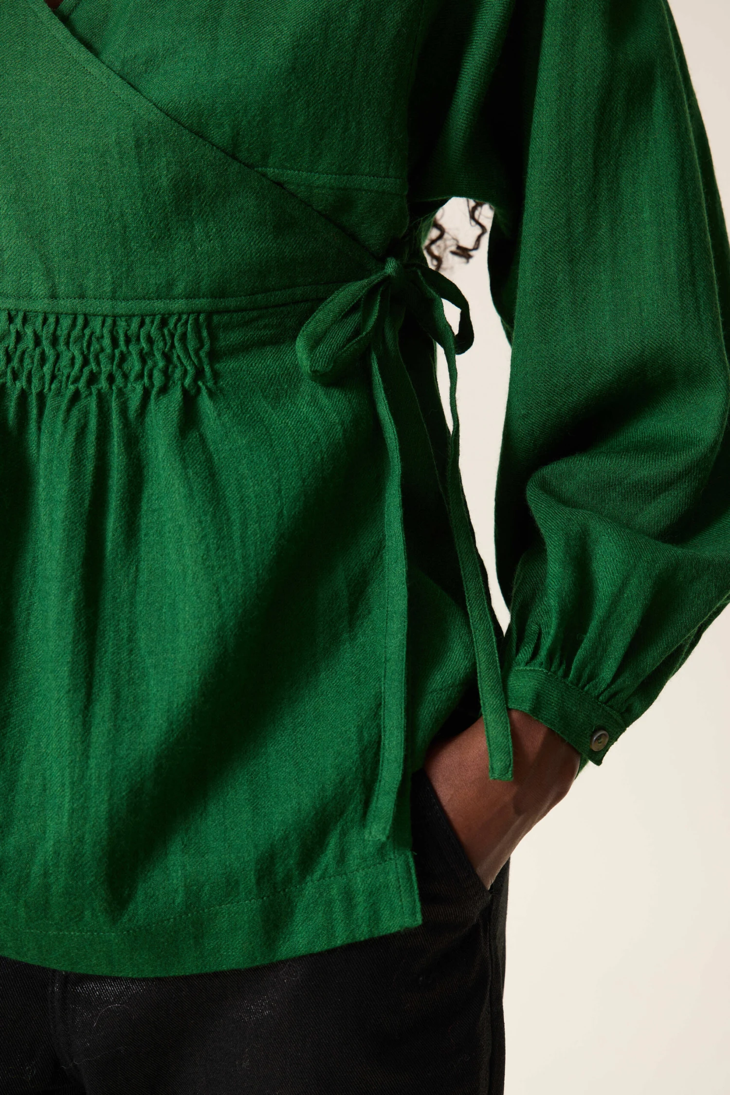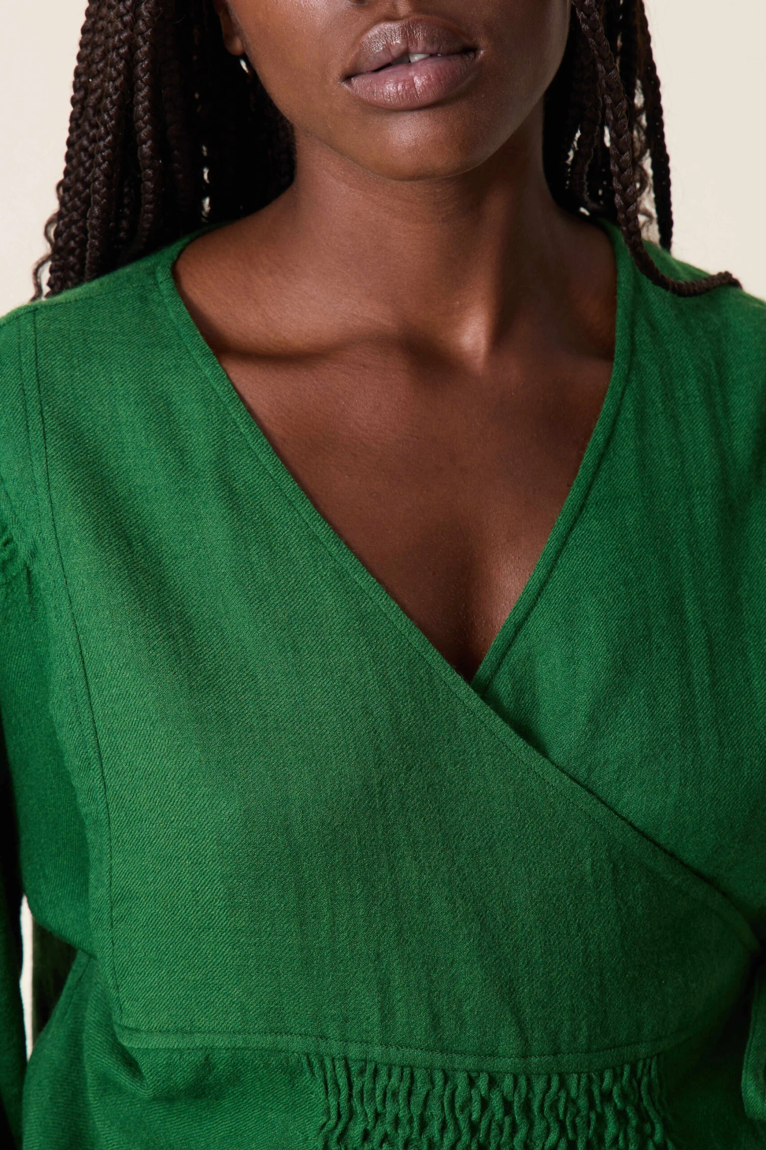 L’esprit cache-cĆur du dĂ©colletĂ© croisĂ© et les fronces au niveau des Ă©paules et sous la poitrine apportent fĂ©minitĂ© et Ă©lĂ©gance Ă la silhouette de la femme Leon & Harper.