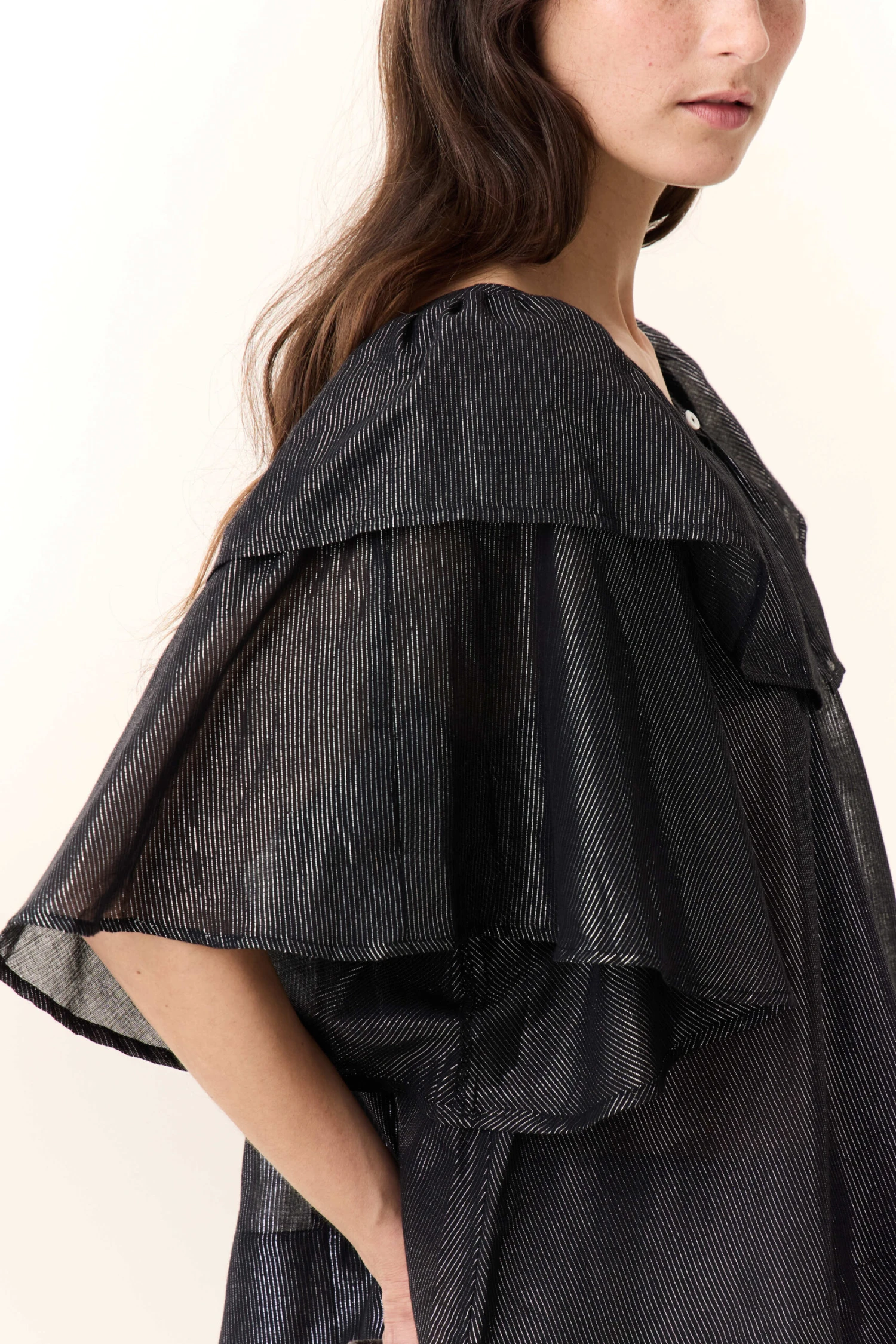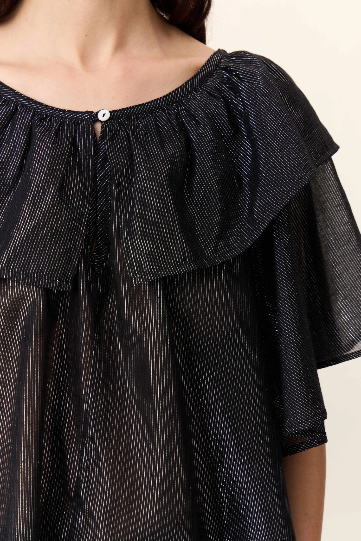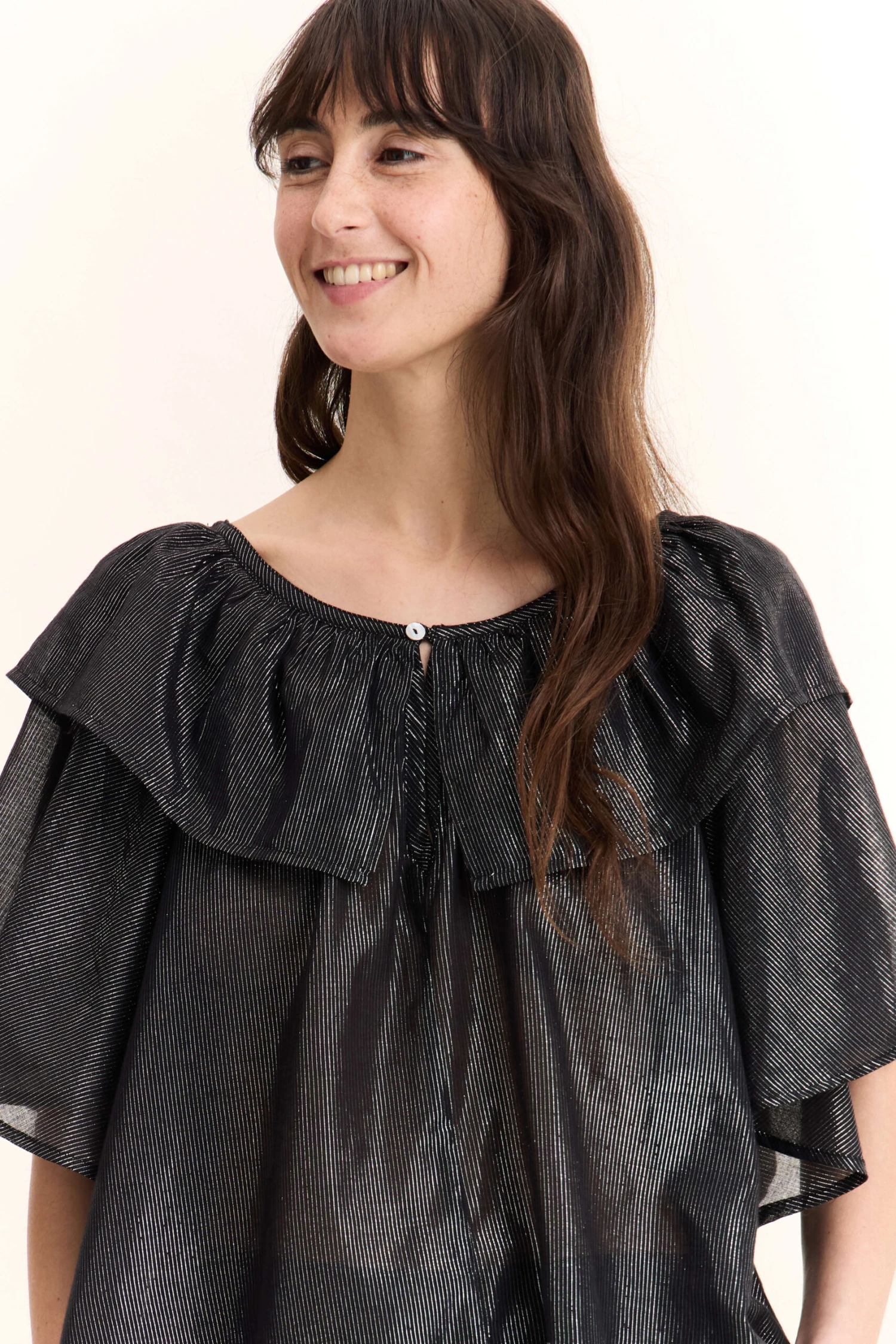 La blouse Casey Strp allie romantisme et audace. Son col dégagé sublimé par un large volant habille délicatement les épaules, et son imprimé brillant illumine la silhouette de la femme Leon & Harper pour une allure élégante et féminine.
