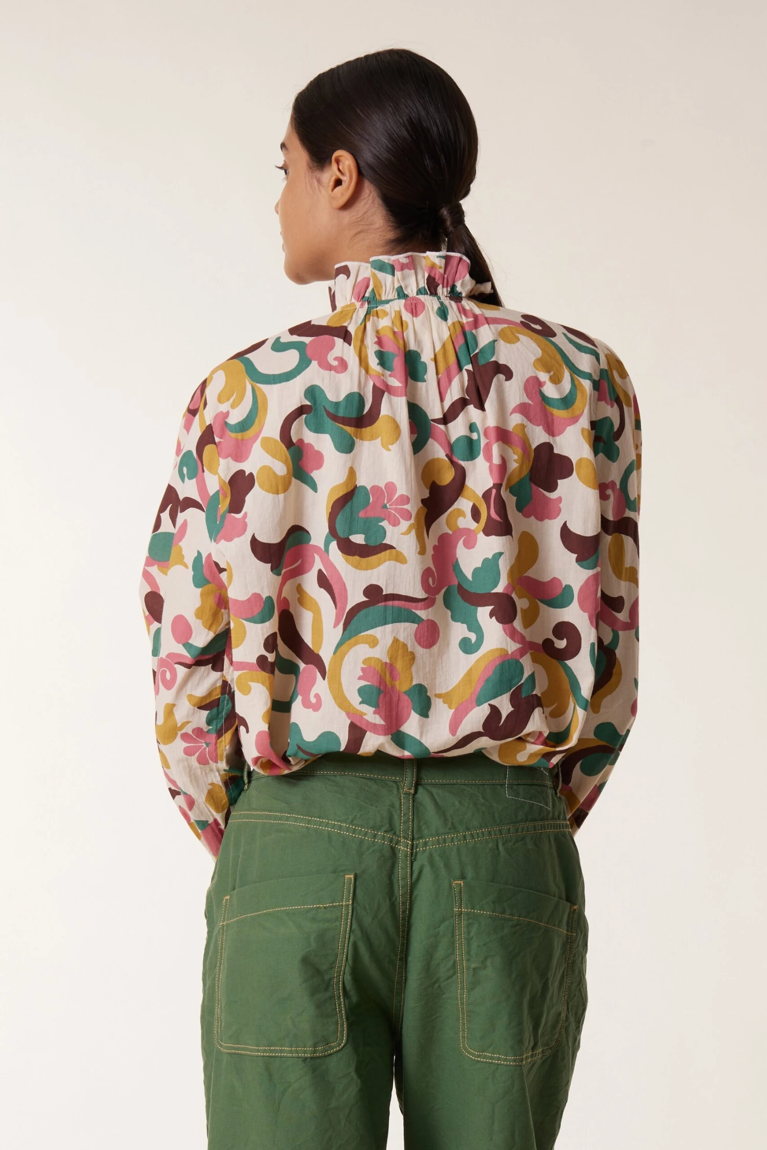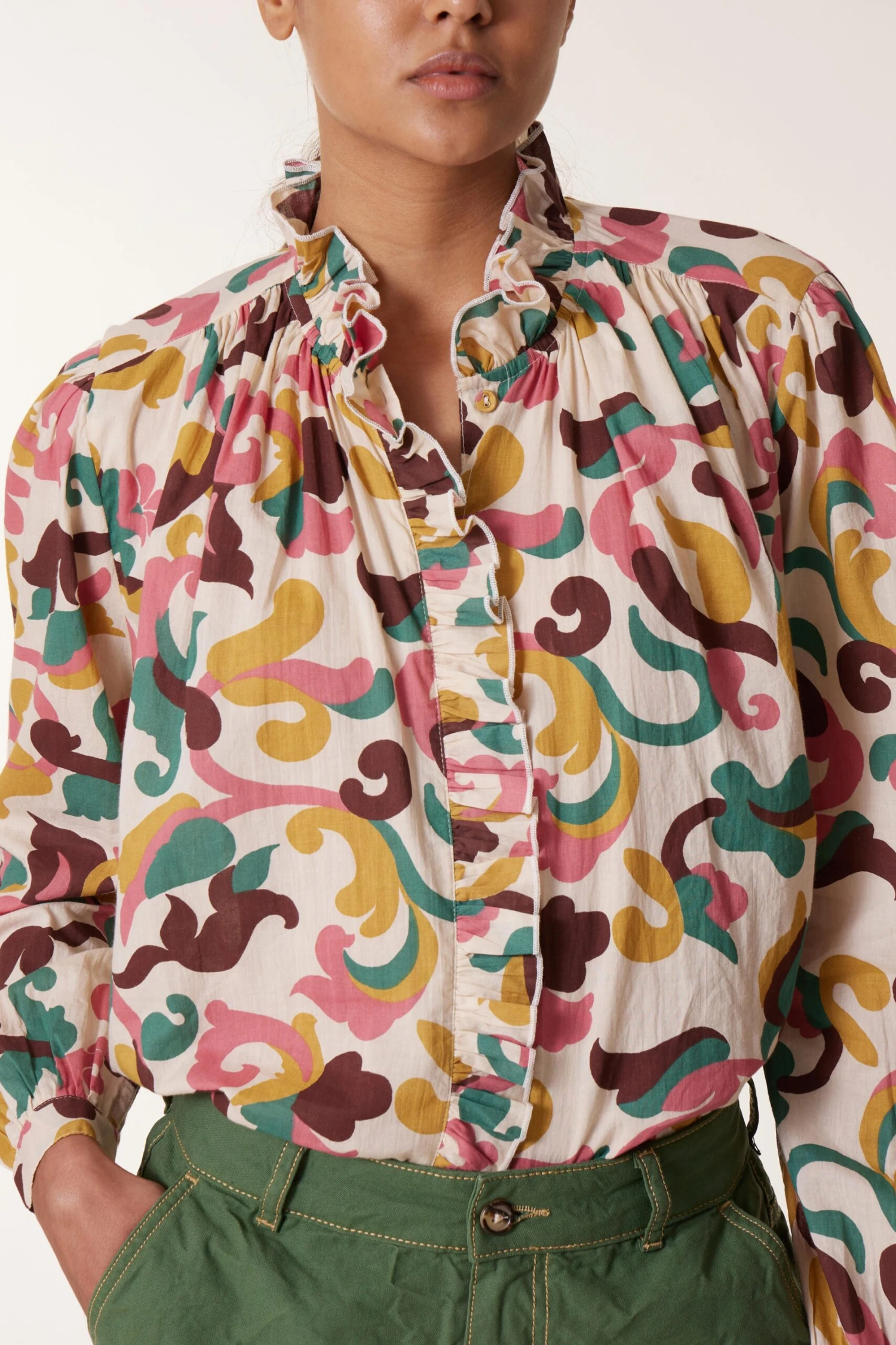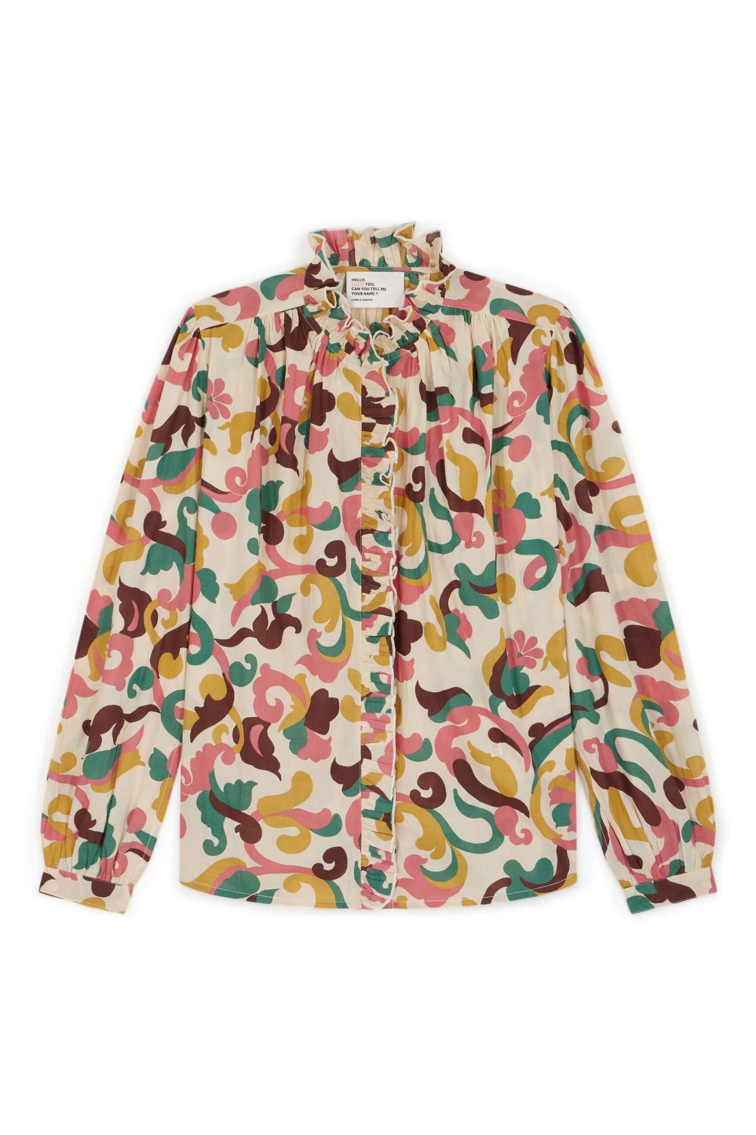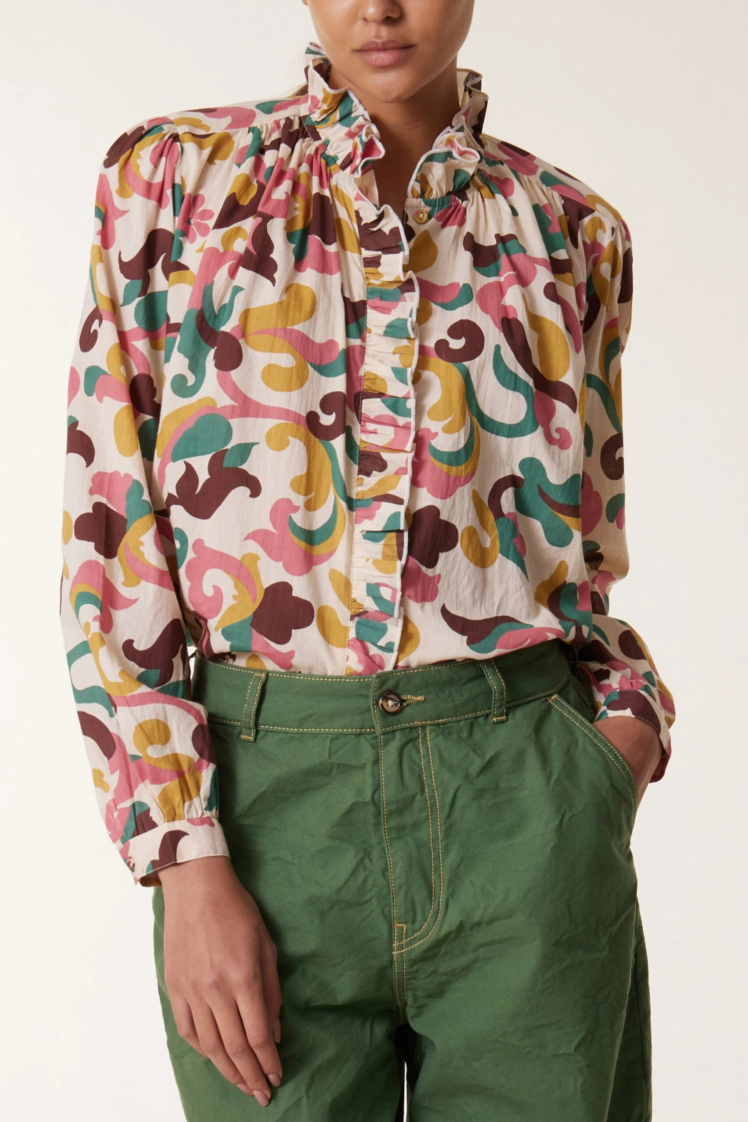 Avec ses volants, la chemise Chypre Patch est la chemise romantique par excellence. Revisitée avec un imprimé arabesque, ses couleurs estivales en font un indispensable de cette saison. Son col haut à volants fait ressortir le côté bohème chic de la femme Leon & Harper.