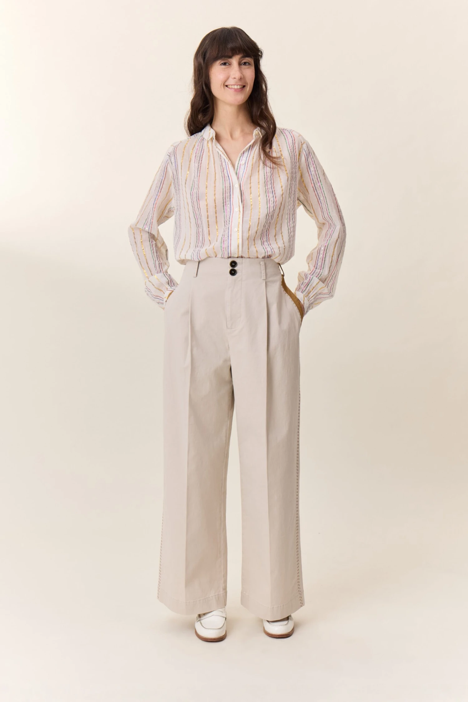 La chemise Cob illumine le vestiaire de la femme Leon & Harper avec son délicat imprimé à rayures métallisées. Avec sa coupe fluide et son design intemporel, elle apporte la touche d’éclat aux looks printaniers.