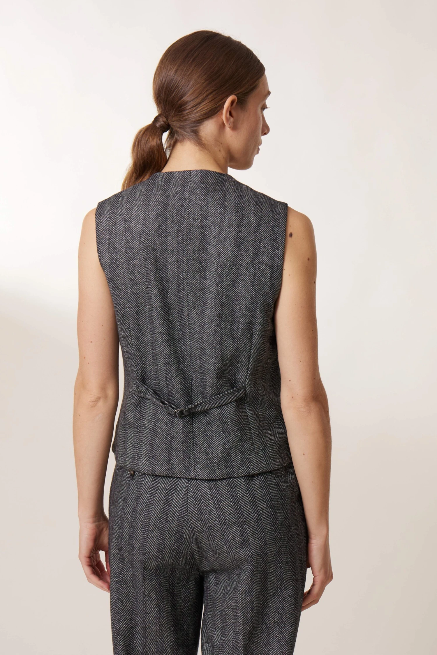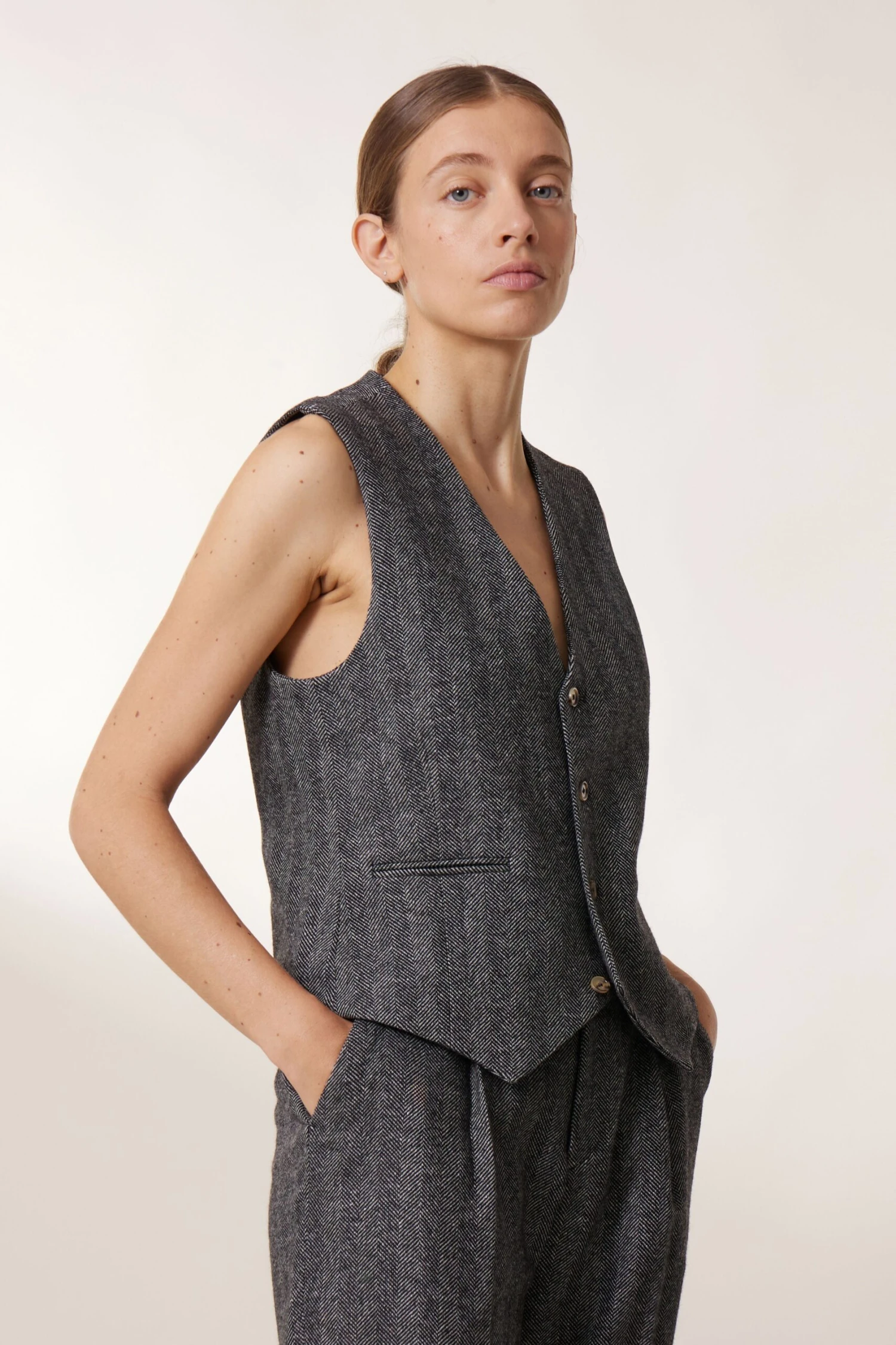 Le gilet Valet Chev parfait les looks d’hiver de la femme Leon & harper avec son motif intemporel à chevrons. On l’associe avec la veste Volvert Chev et le pantalon Pummy Chev pour un look élégant.