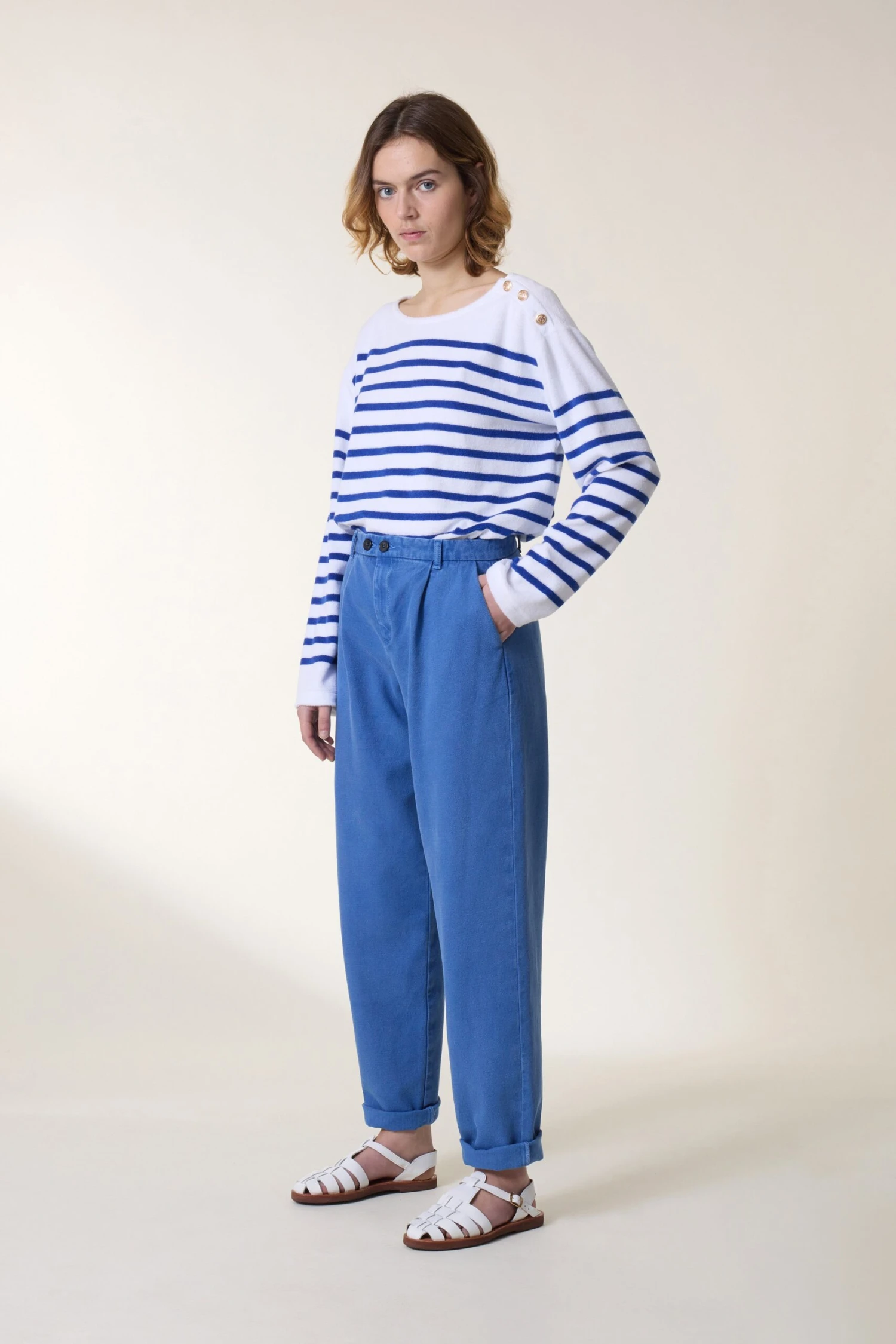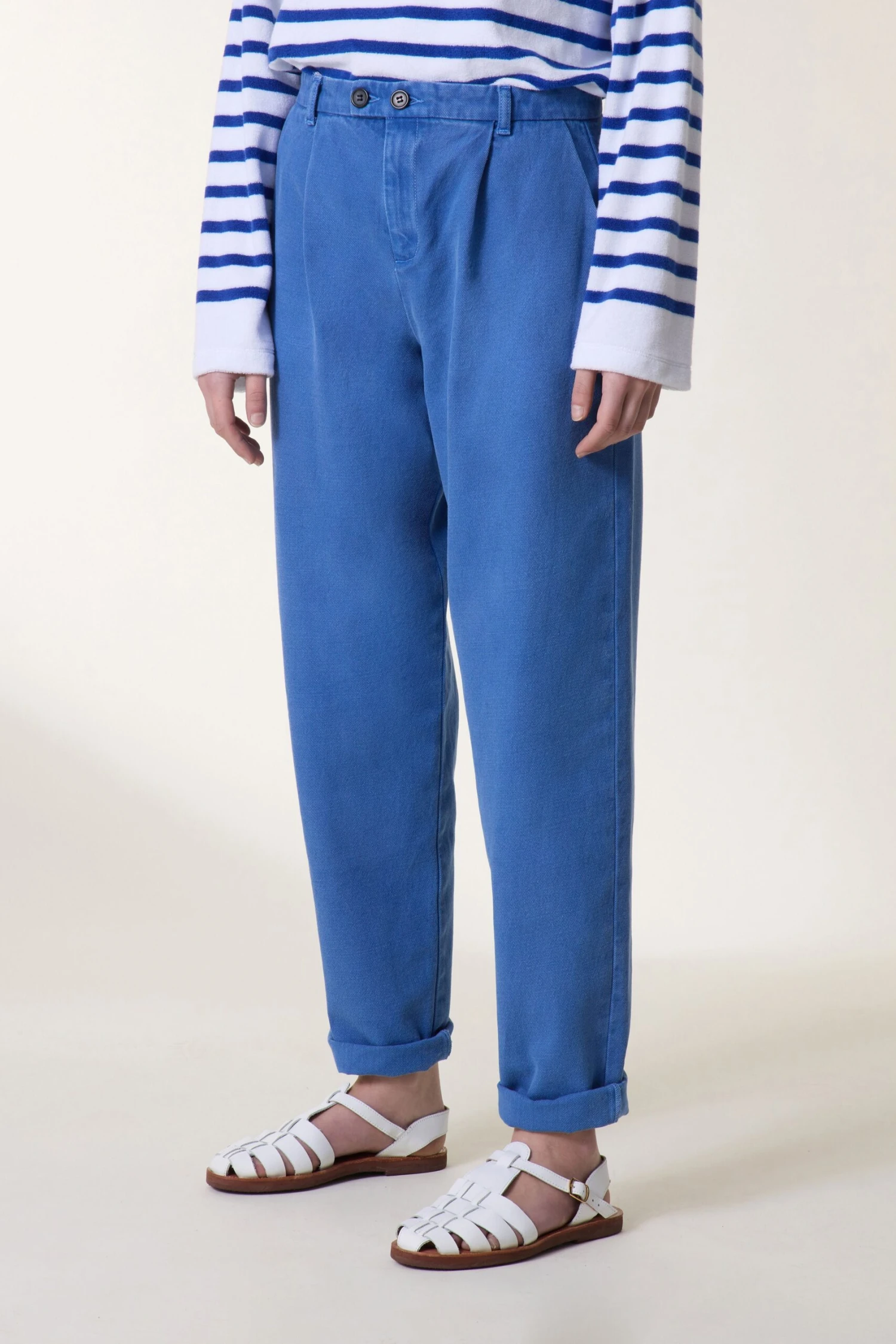 Le pantalon Prodige PL2 est un must-have au fil des saisons. Avec sa coupe légèrement boule et ses deux boutons à la taille, il sublime la silhouette de la femme Leon & Harper. Associé à des sandales ou des mules et un t-shirt à message, il est le parfait allié des tenues décontractées.