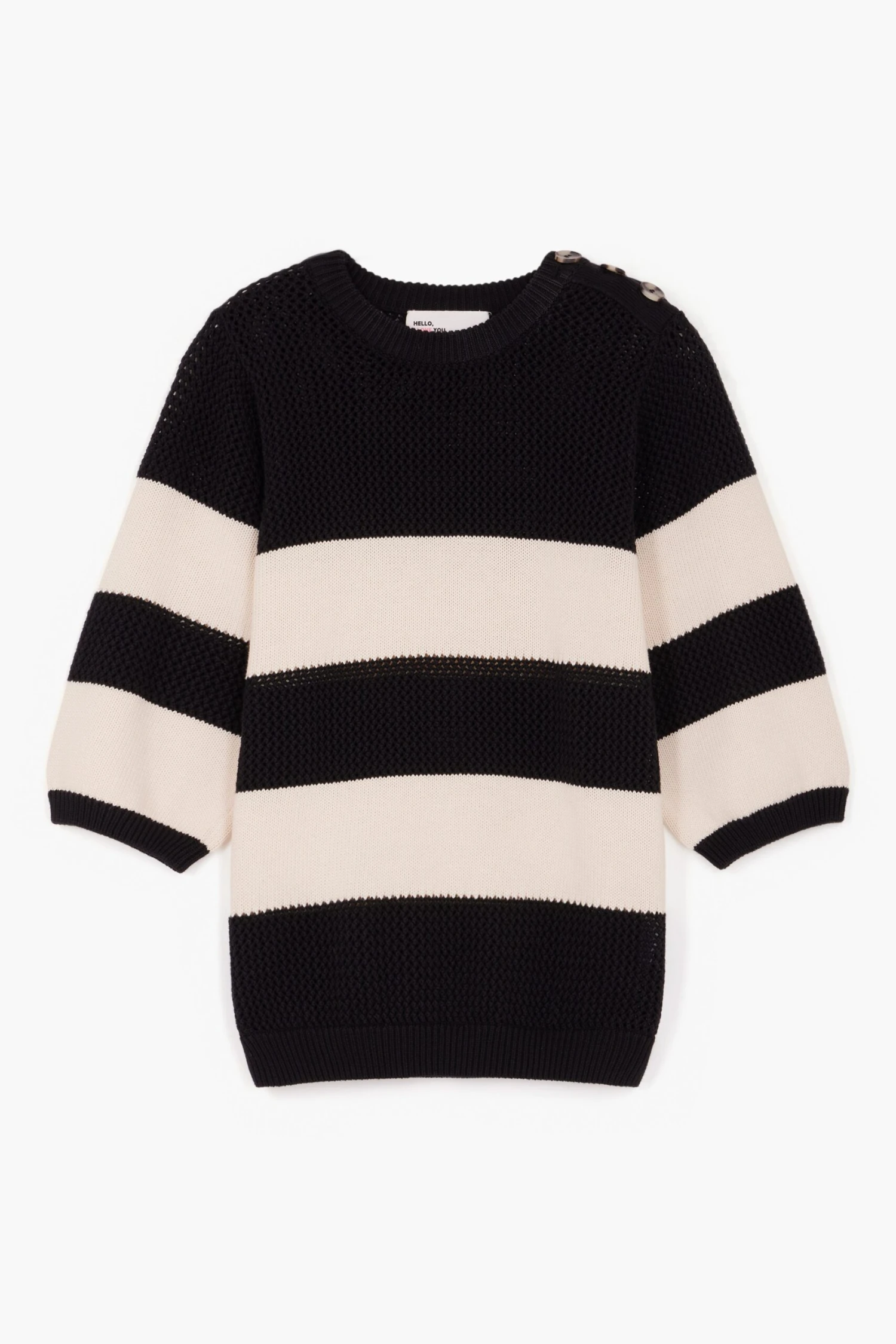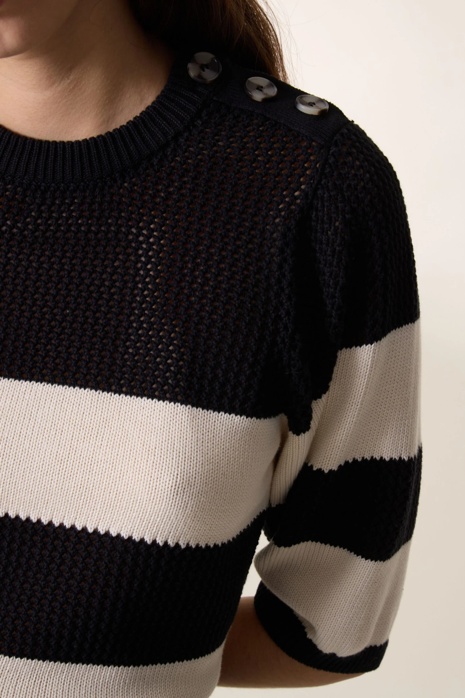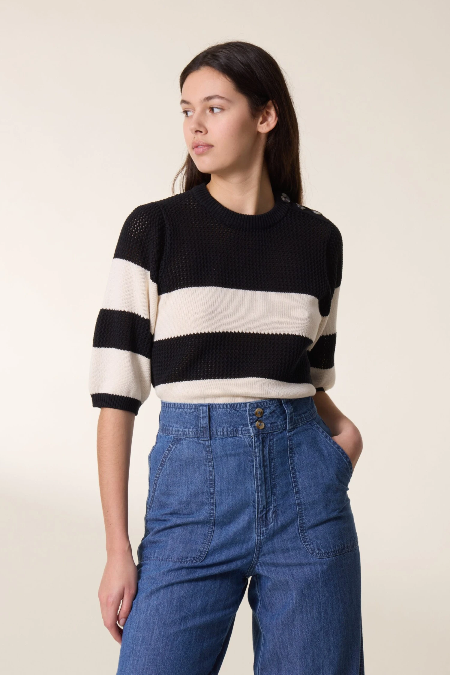 Le pull Maan Mix est le pull coup de cÅ“ur de cette saison. Parfait pour le printemps et les soirées d’été, son aspect crochet et son inspiration marinière en font un indispensable du vestiaire de la femme Leon & Harper.