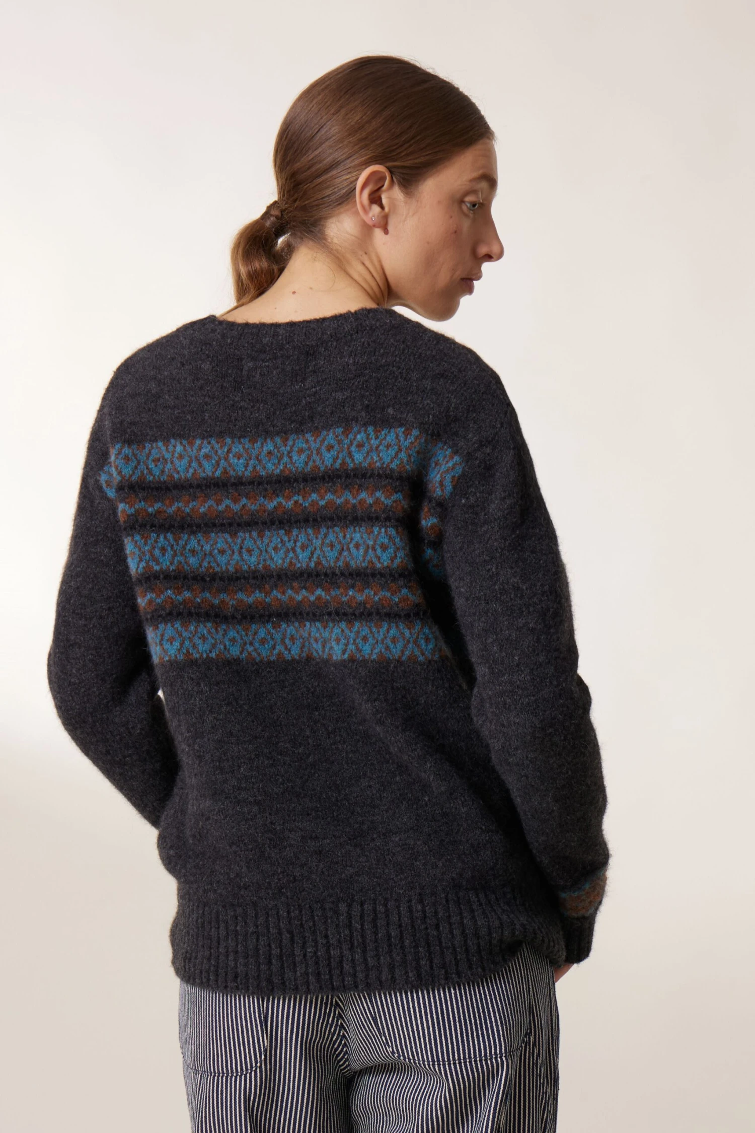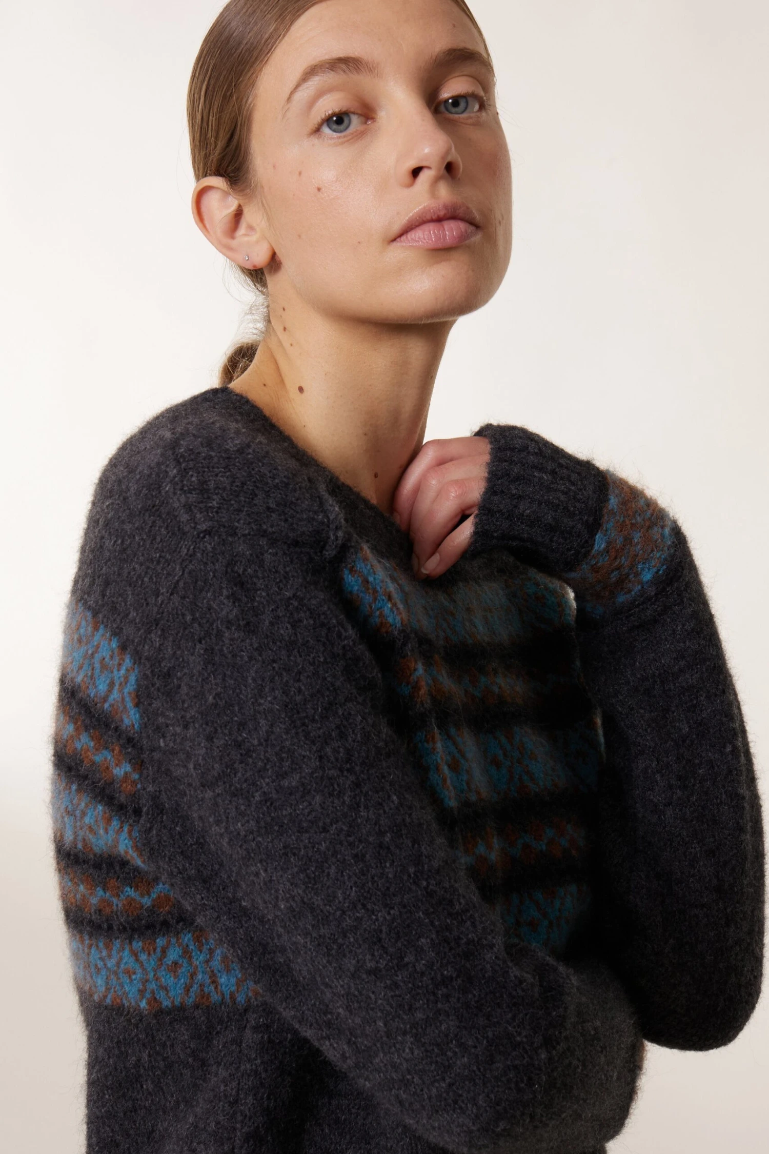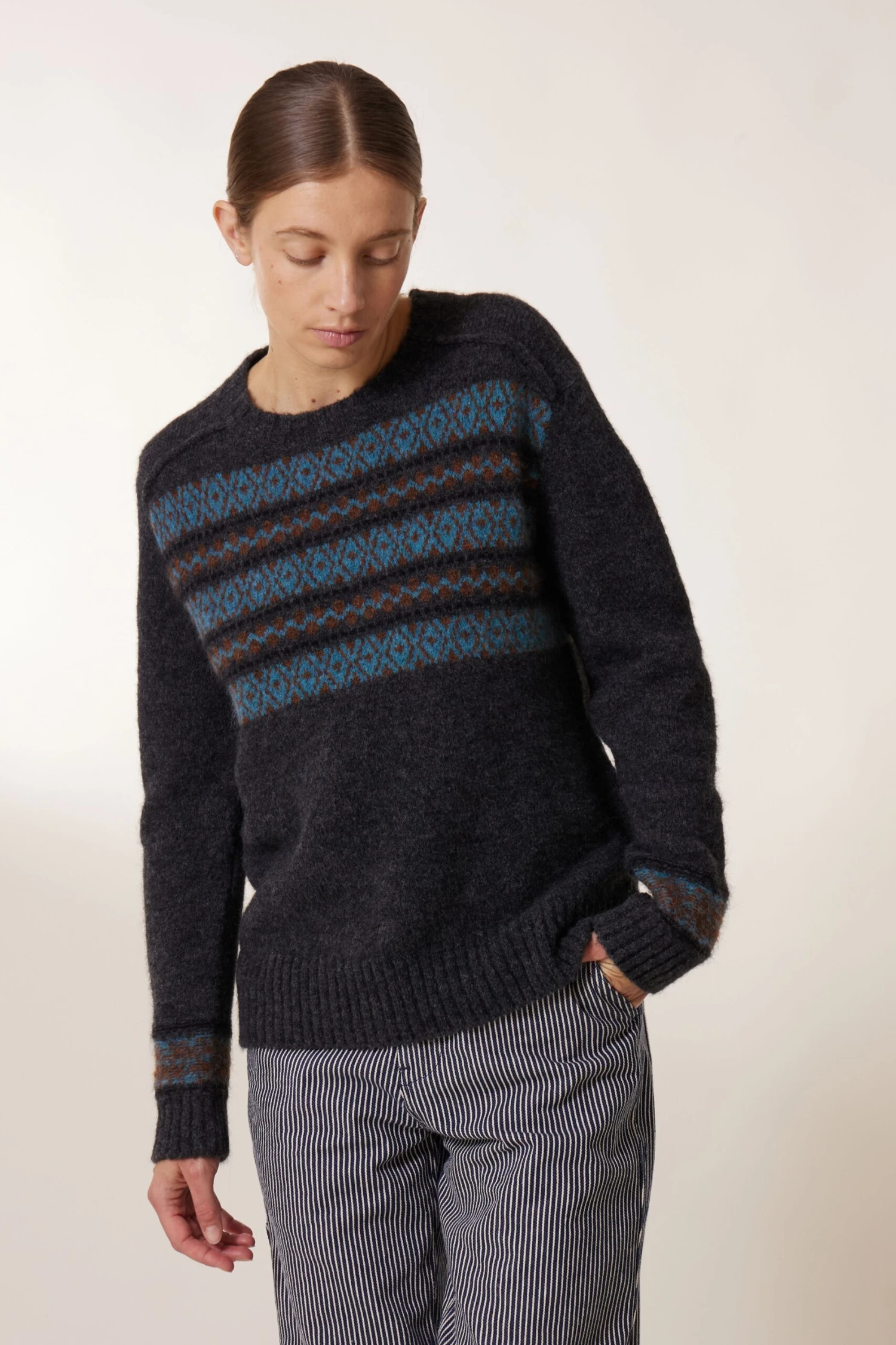 La femme Leon & Harper succombe aux motifs scandinaves du pull Meet Jac. Sa composition en laine, alpaga et merinos assure chaleur et confort pour cet hiver.