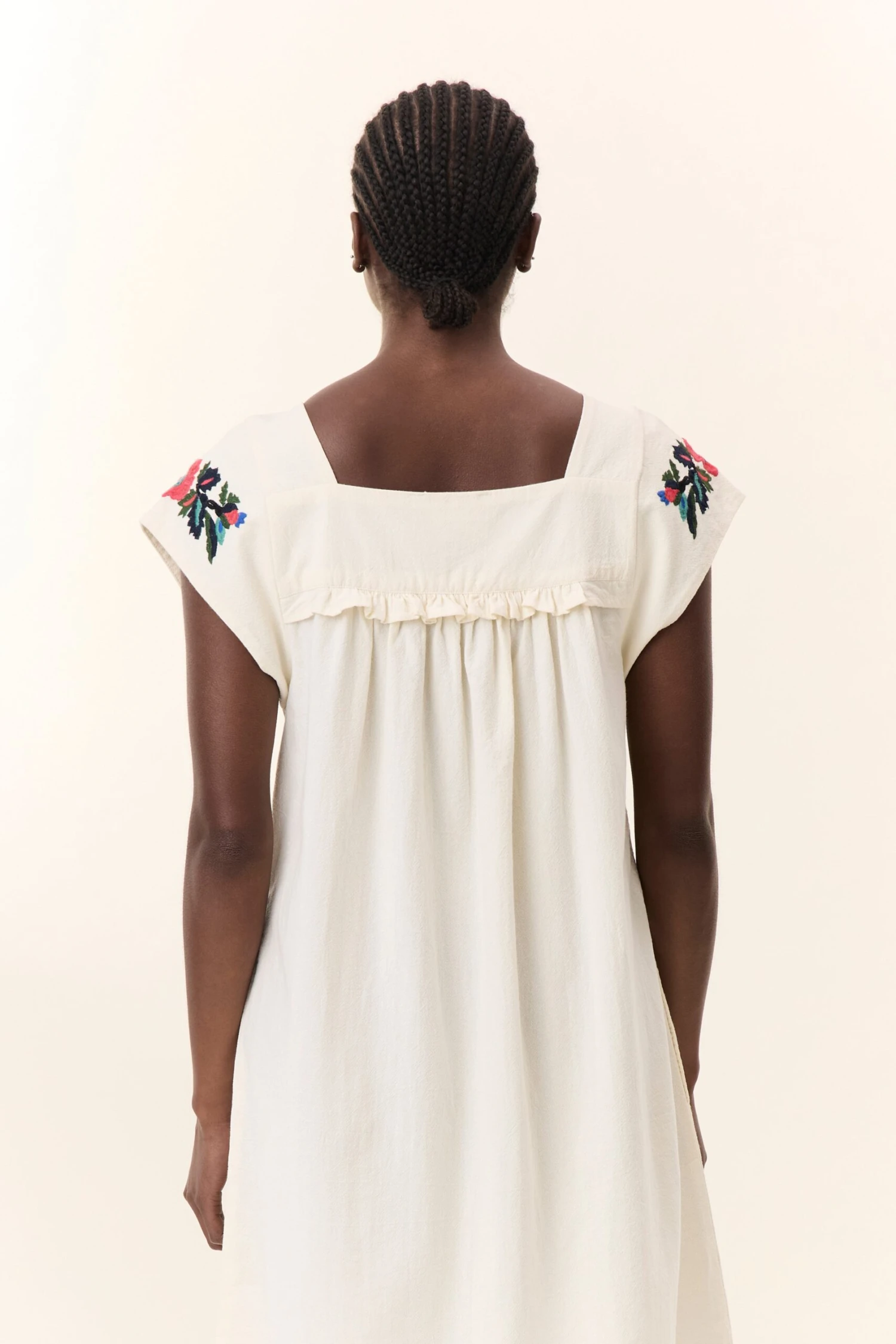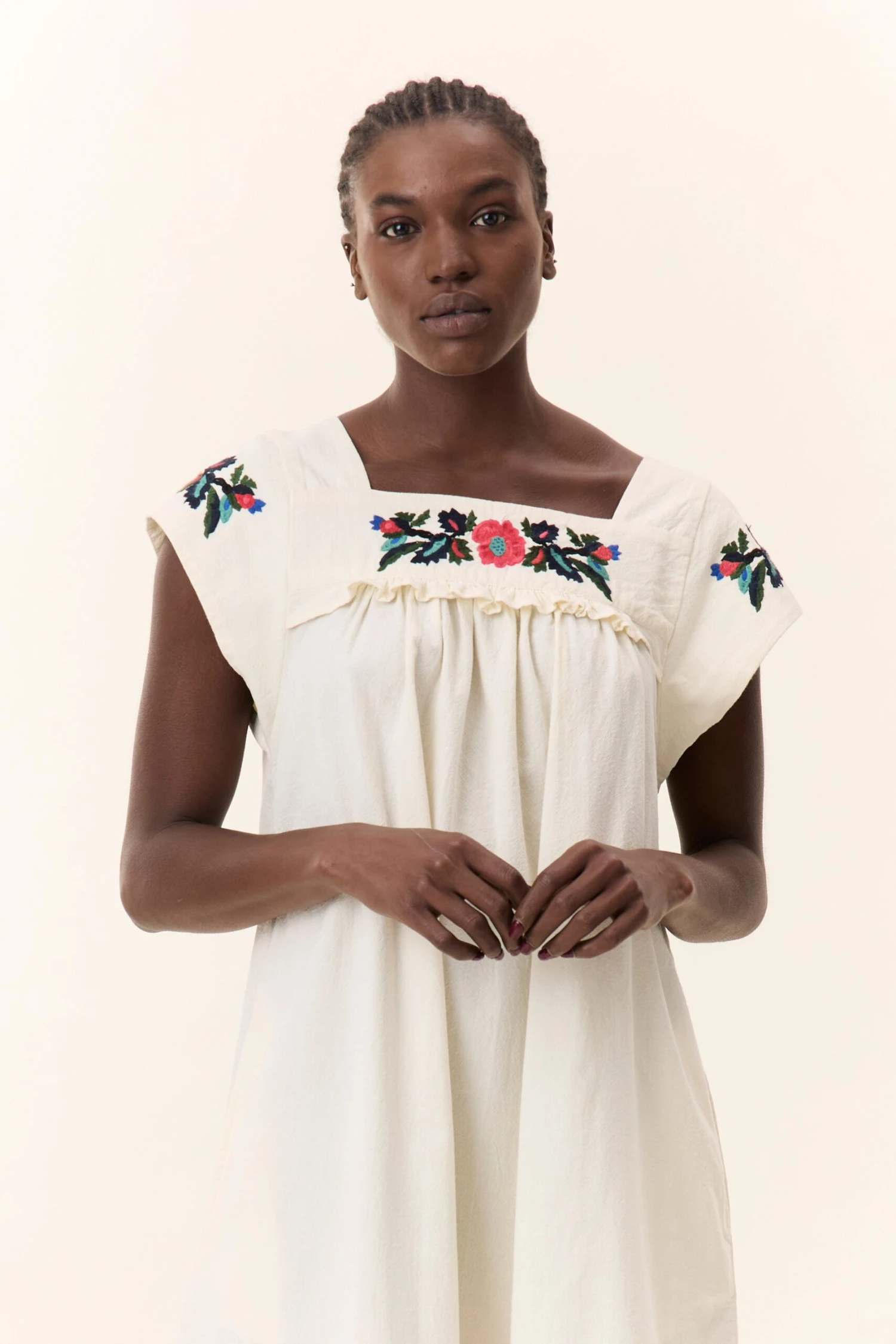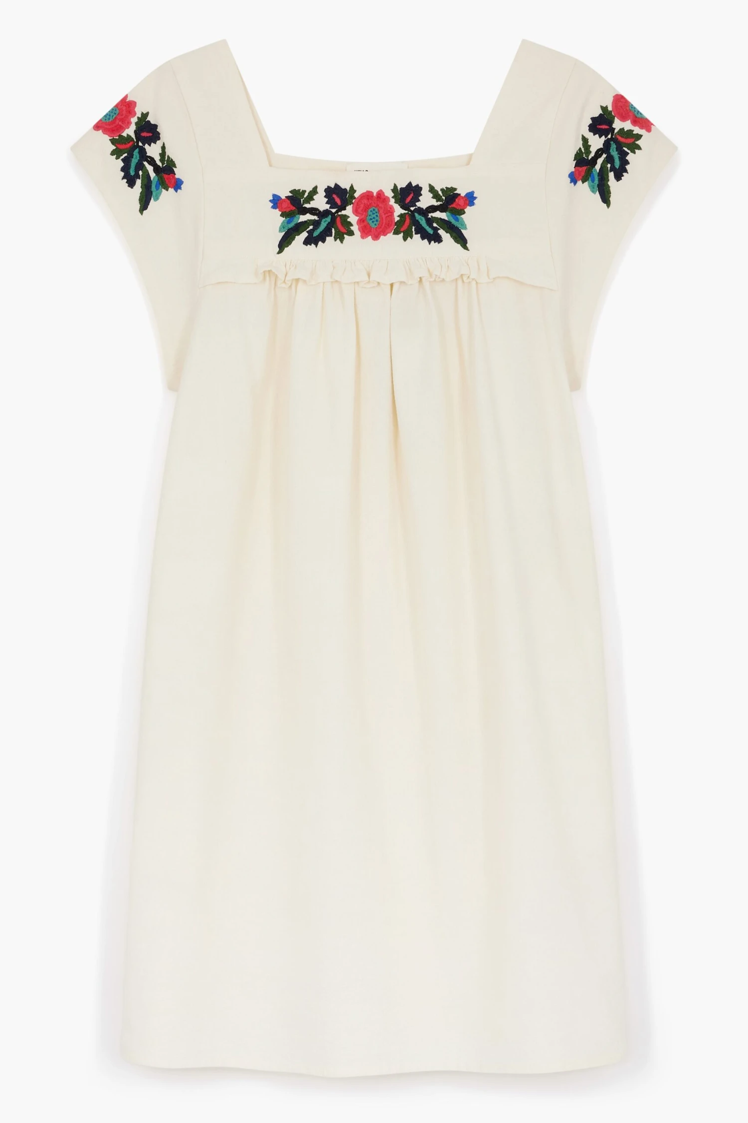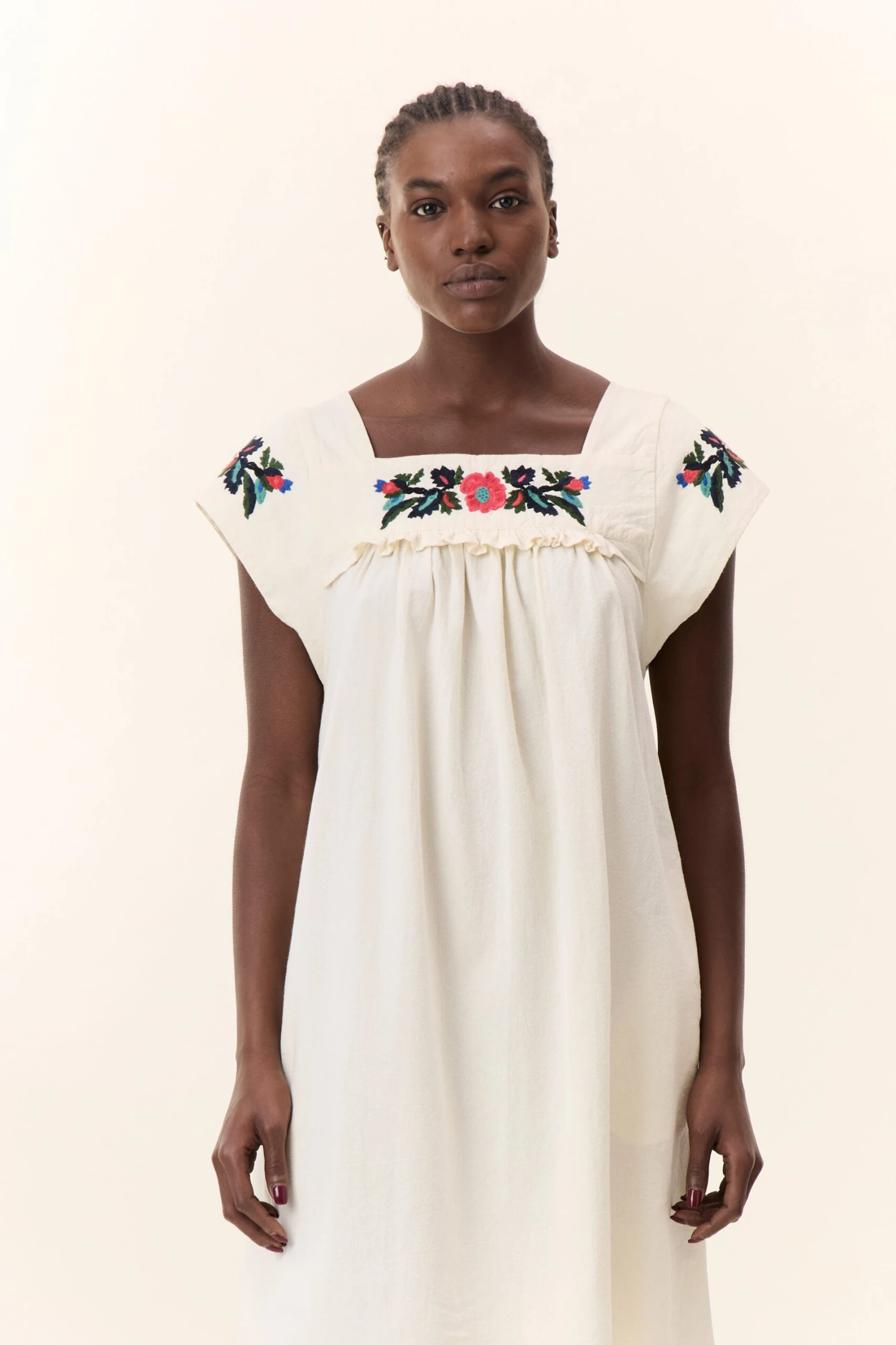 La robe Raddix Brd est une pièce délicate et bohème avec son tissu fluide et sa coupe droite. Son encolure carrée et ses manches courtes mettent en valeur une broderie florale qui apporte une touche romantique. Elle s’accorde avec des sandales ou des bottines pour un look estival ou mi-saison.