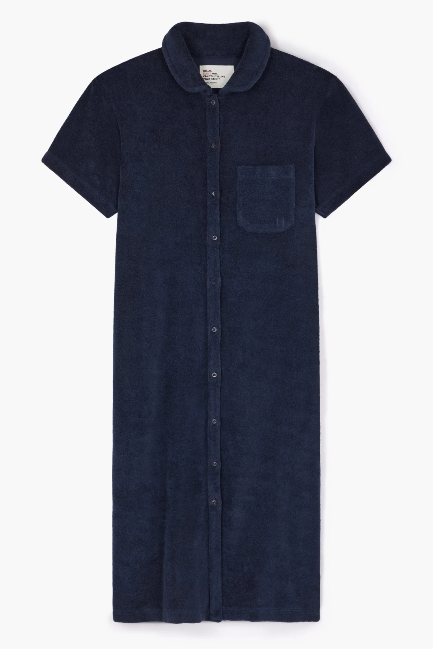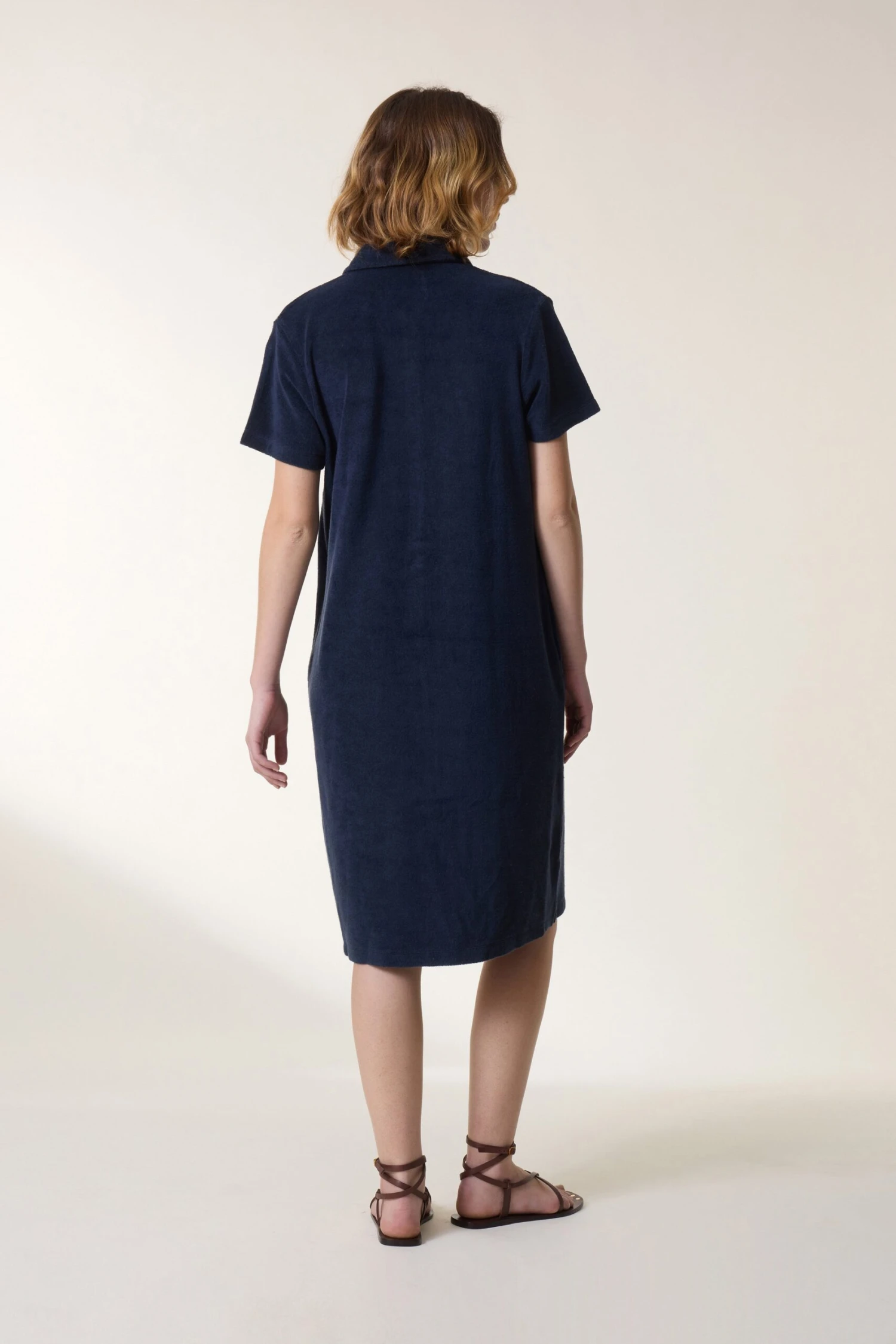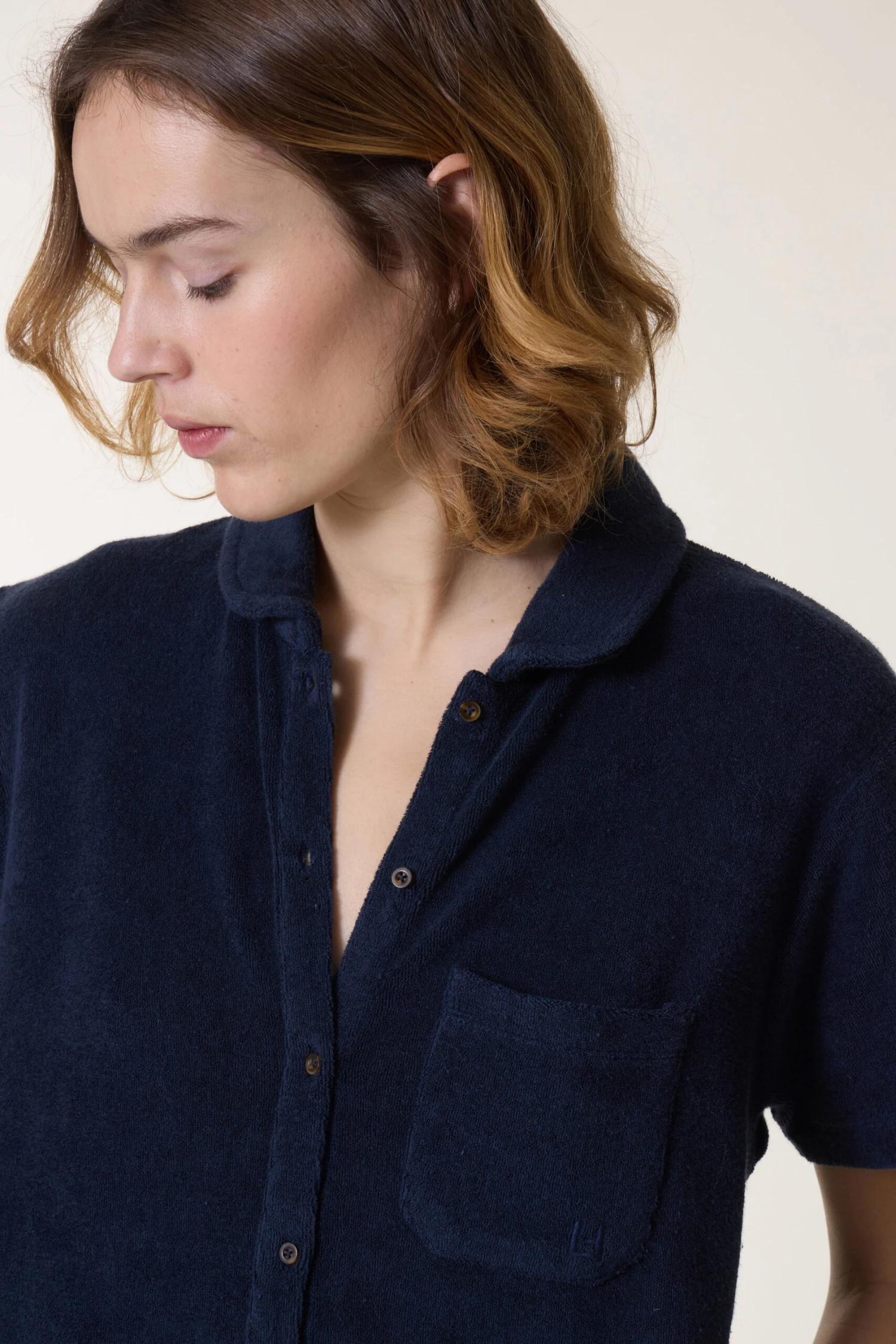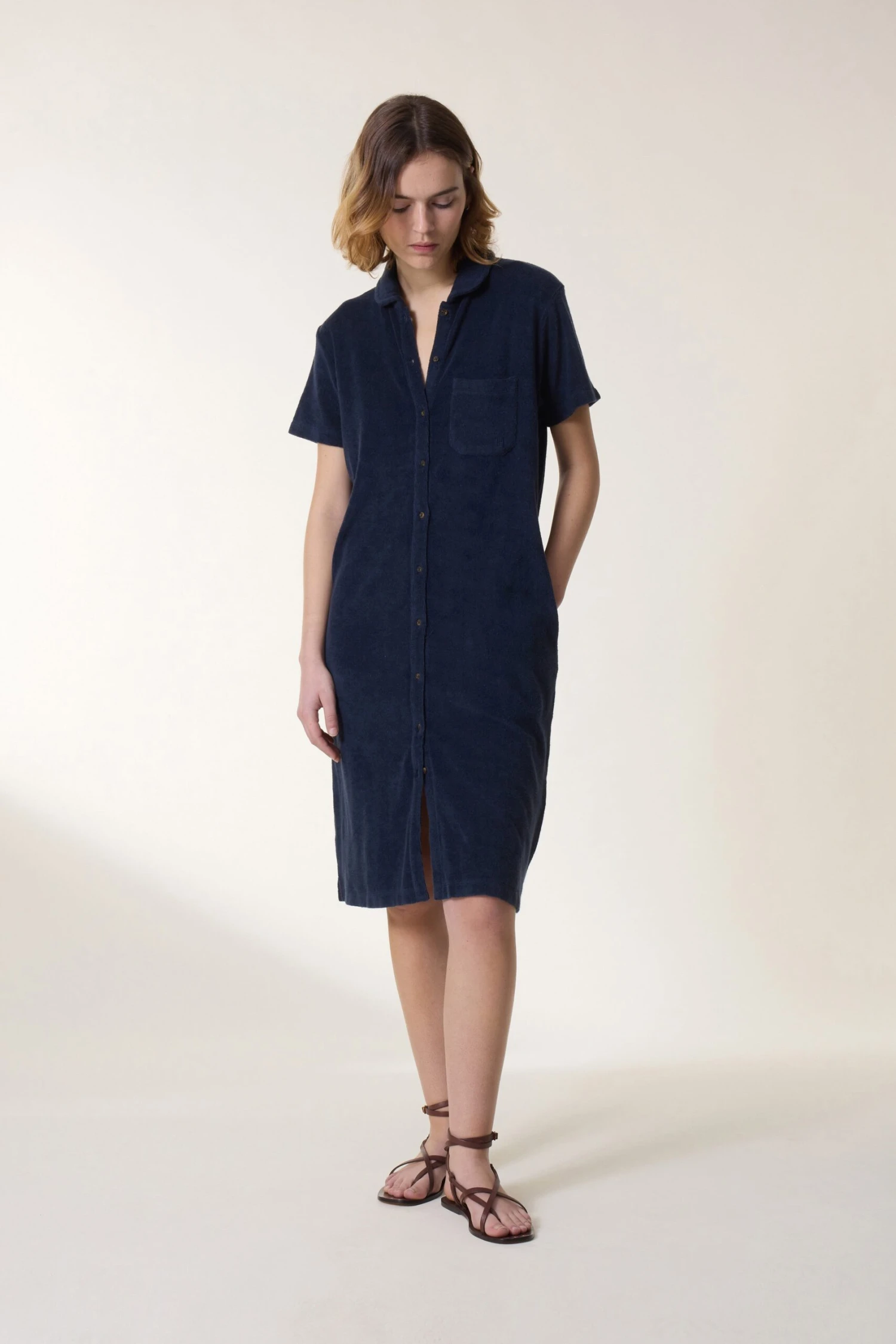 La robe Raquel Plain est une robe chemise, facile à porter avec son tissu éponge, sa patte de boutonnage. La femme Leon & Harper ne la quitte pas de la journée.