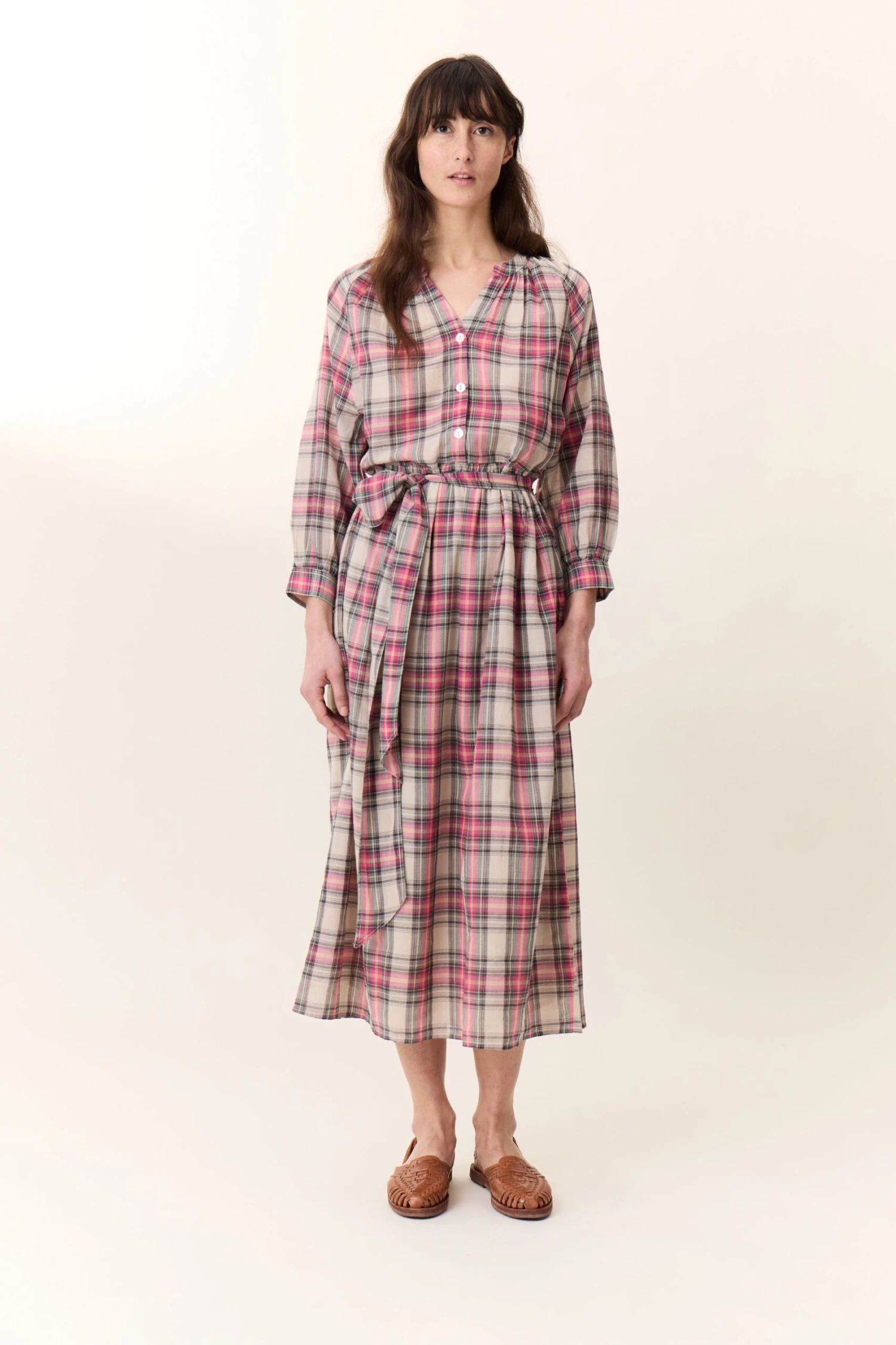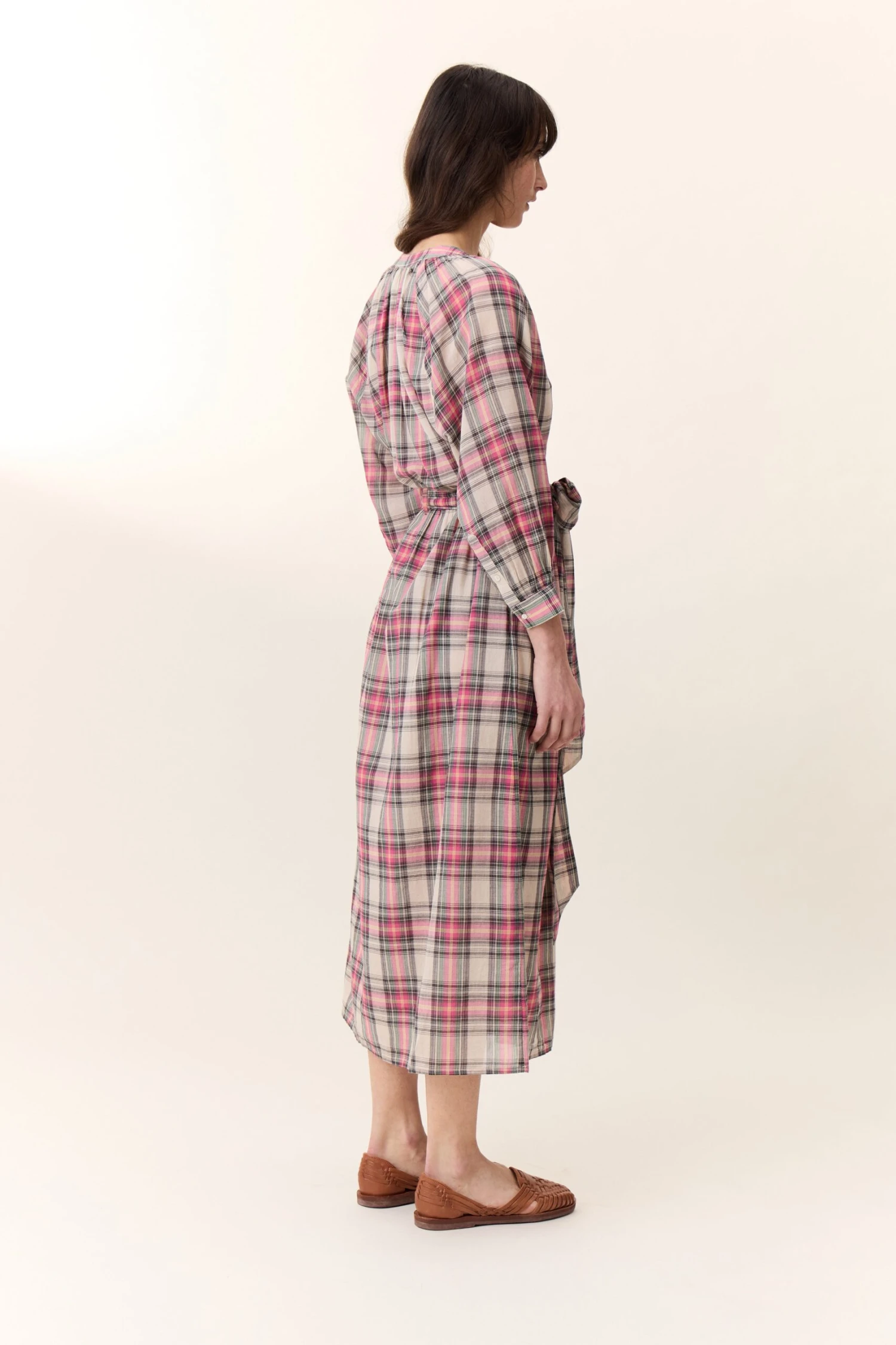 La robe Runa Crx est une pièce élégante et colorée grâce à son motif à carreaux. Sa coupe ample, sa ceinture nouée à la taille et ses manches raglans longues légèrement bouffantes ajoutent une touche sophistiquée et décontractée à la fois. C’est la robe idéale pour une tenue de jour chic ou une soirée estivale.
