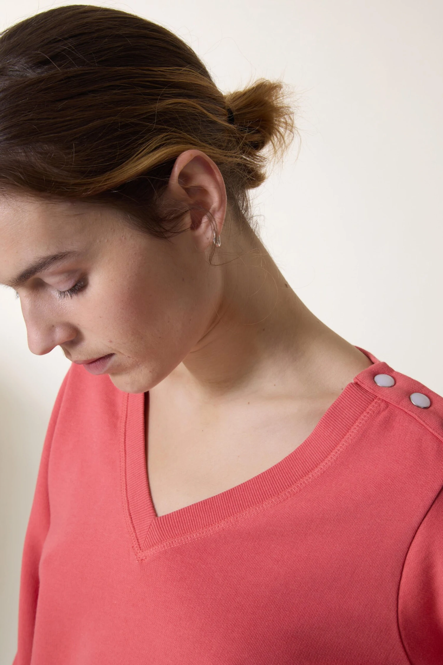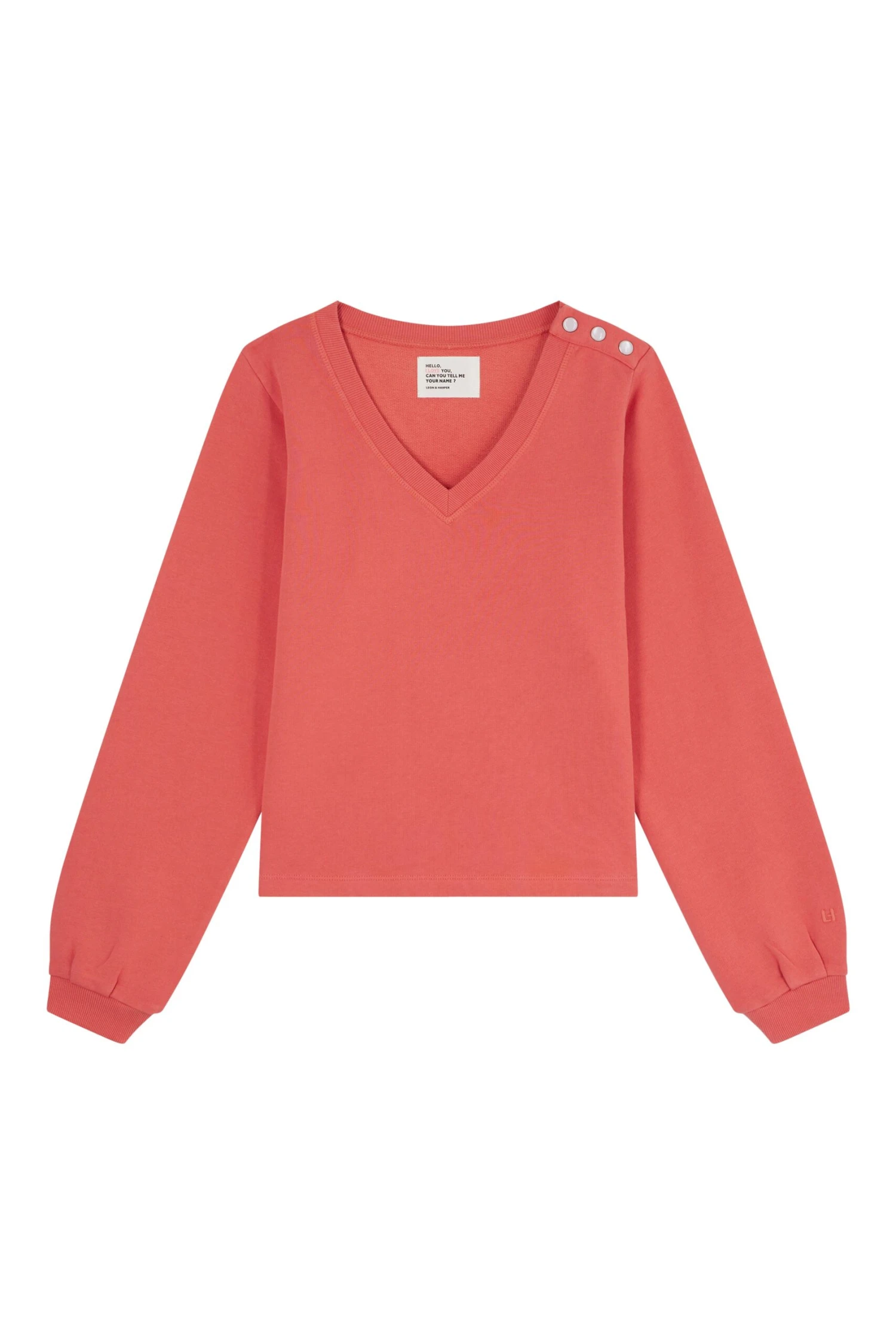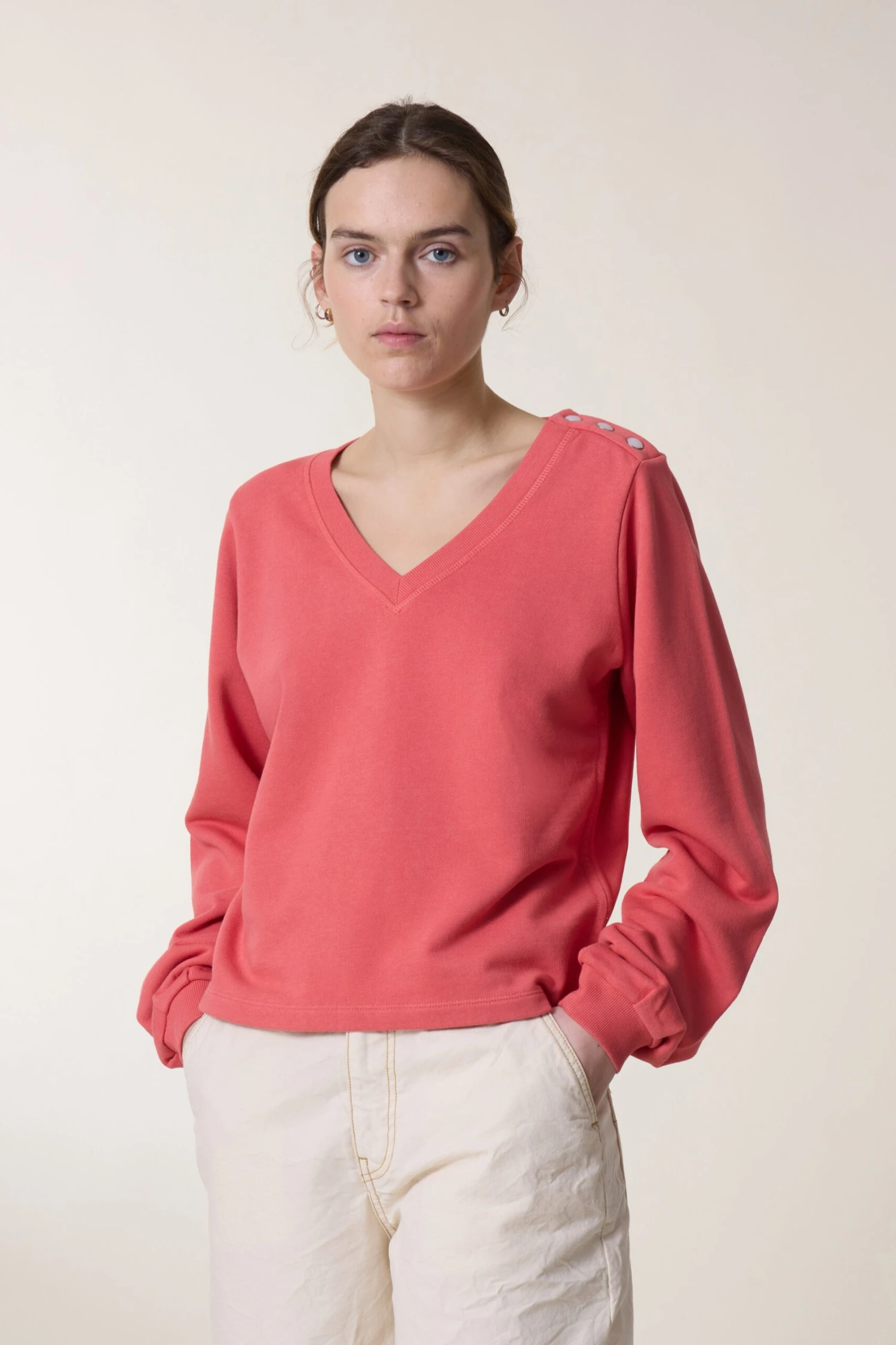 Le sweat Sarah Plain affiche un col V profond et surpiqué, ainsi que des boutons nacrés à l’épaule. Sa coupe droite et ses manches longues, resserrées aux poignets, en font un choix confortable et tendance pour l’été.