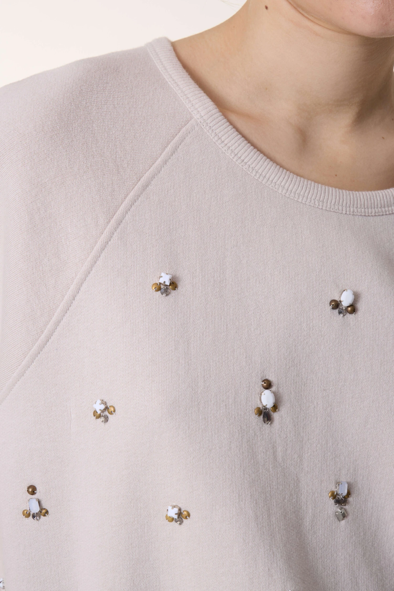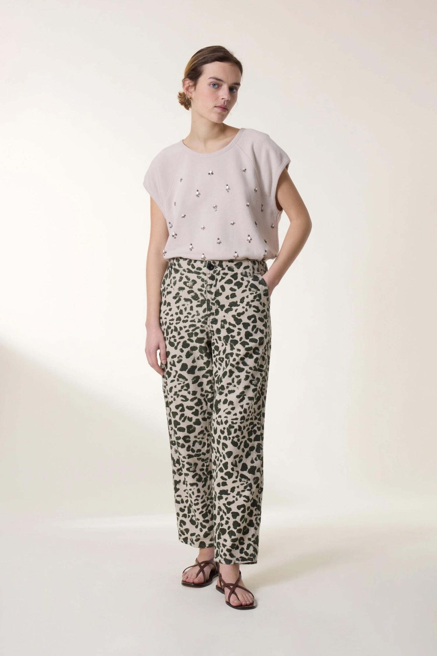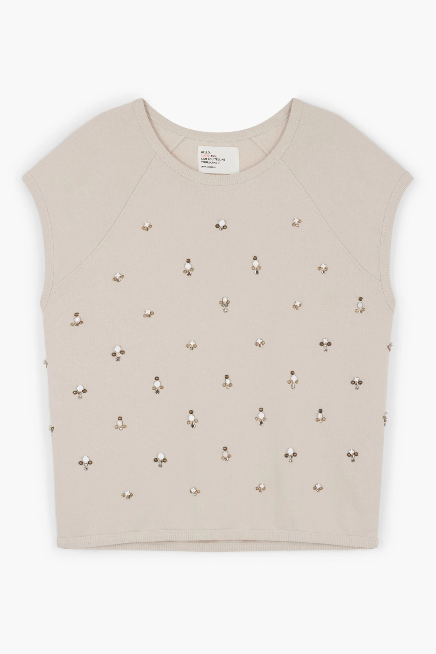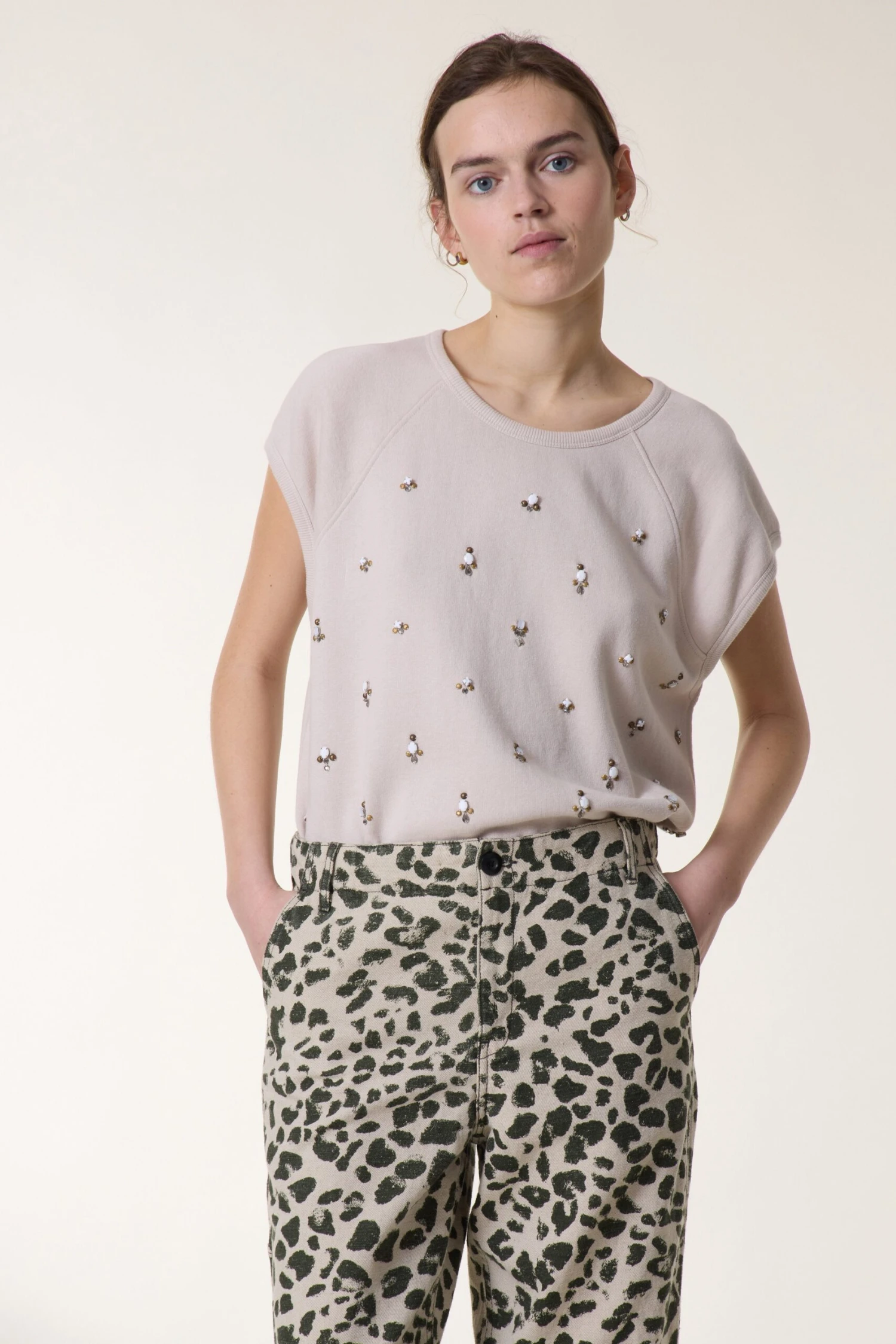 Le sweat sans manche Sirop Precious arbore de délicates broderies perlées sur l’avant, ajoutant une touche de romantisme. La femme Leon & Harper le porte au-dessus d’une chemise boyfriend pour une allure masculin/féminin réussie.