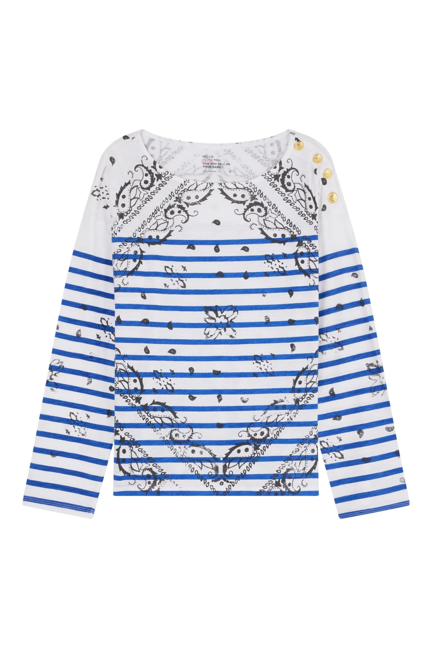 Le t-shirt Thilla Paisley est un modèle à manches longues et col rond, mêlant l’imprimé marinière à des arabesques. Agrémenté de boutons dorés à l’encolure, ce t-shirt en coton biologique offre un style romantique et bohème, parfait pour être porté avec un pantalon et des bottines ou des sabots.