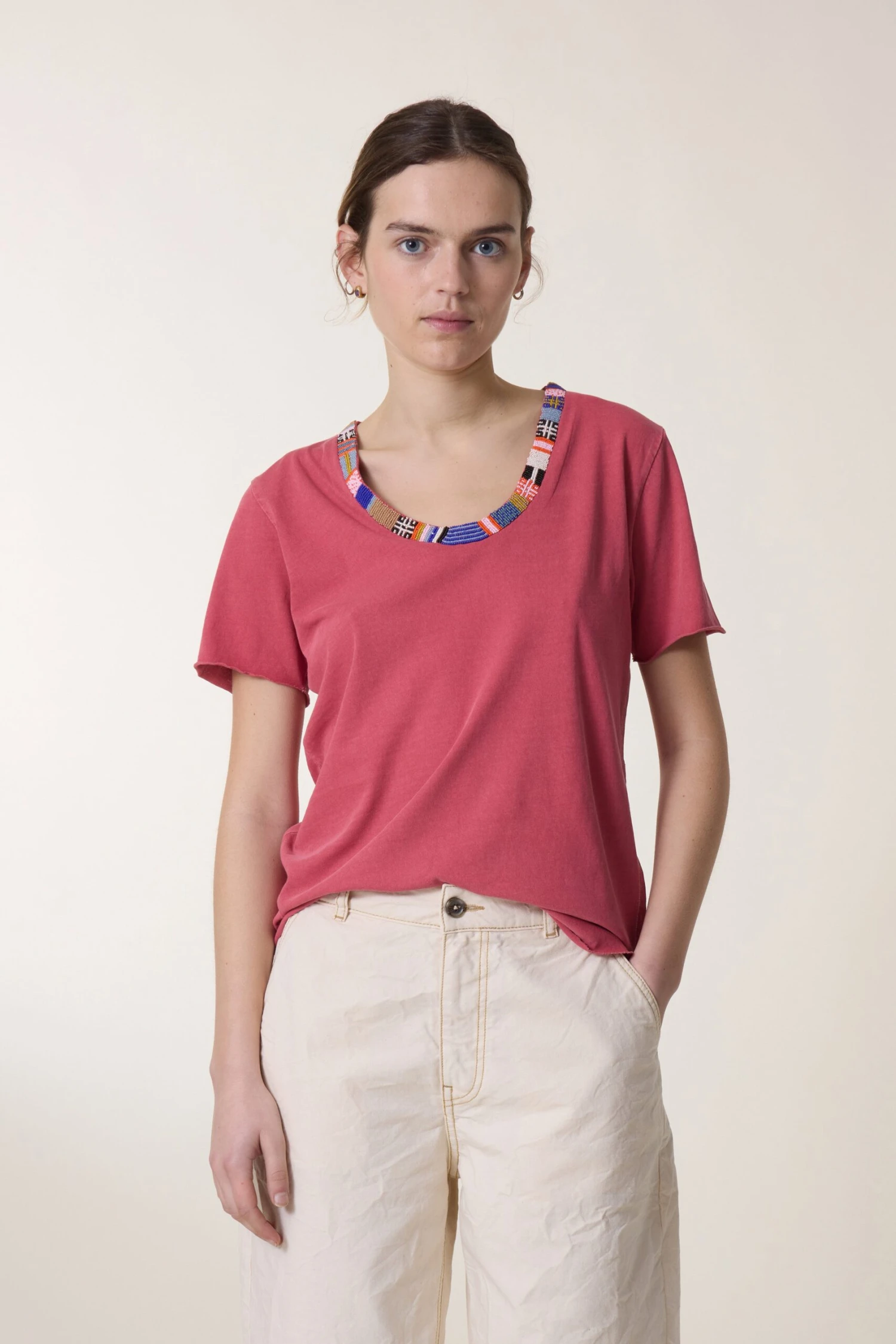 Le t-shirt Tizia Beads est un ajout élégant au vestiaire, confectionné en 100% coton biologique et orné de perles à l’encolure. Disponible dans six coloris différents, il ajoute une touche sophistiquée aux tenues confortables de la femme Leon & Harper.