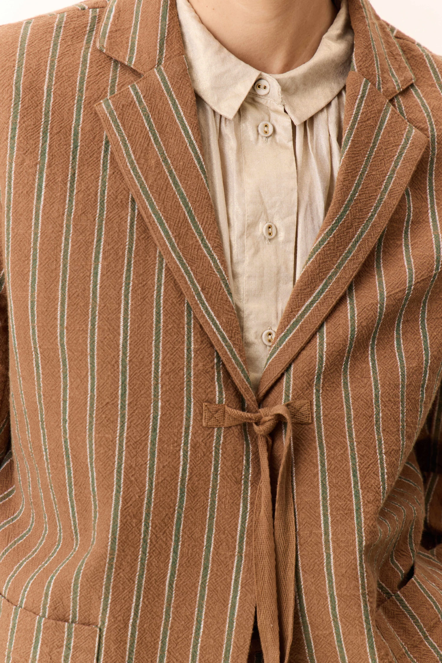 Un blazer revisité dans une version souple et féminine, parfait pour insuffler une touche chic et décontractée au vestiaire de la femme Leon & Harper. Son tissu à rayures lui donne un charme rétro irrésistible. Son col à revers structuré s’ouvre sur une fermeture nouée, délicate et inattendue, qui casse les codes du tailoring classique. À porter aussi bien sur un jean que sur une robe fluide pour une silhouette causual-chic.