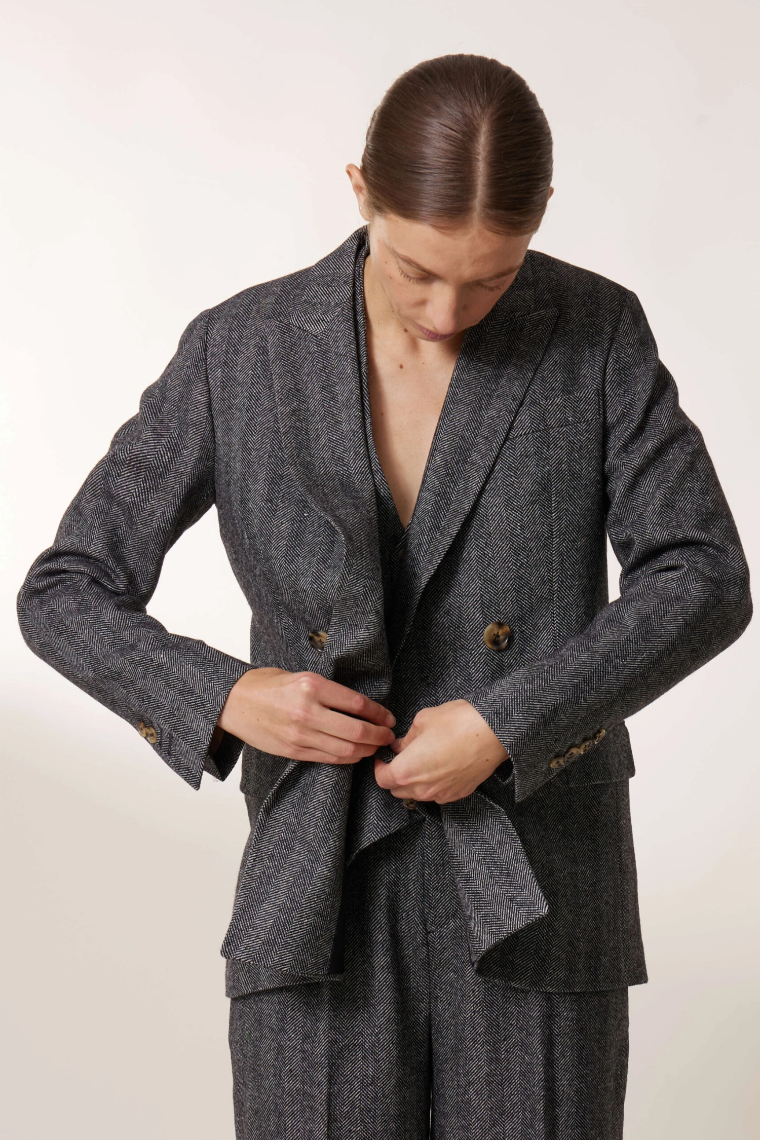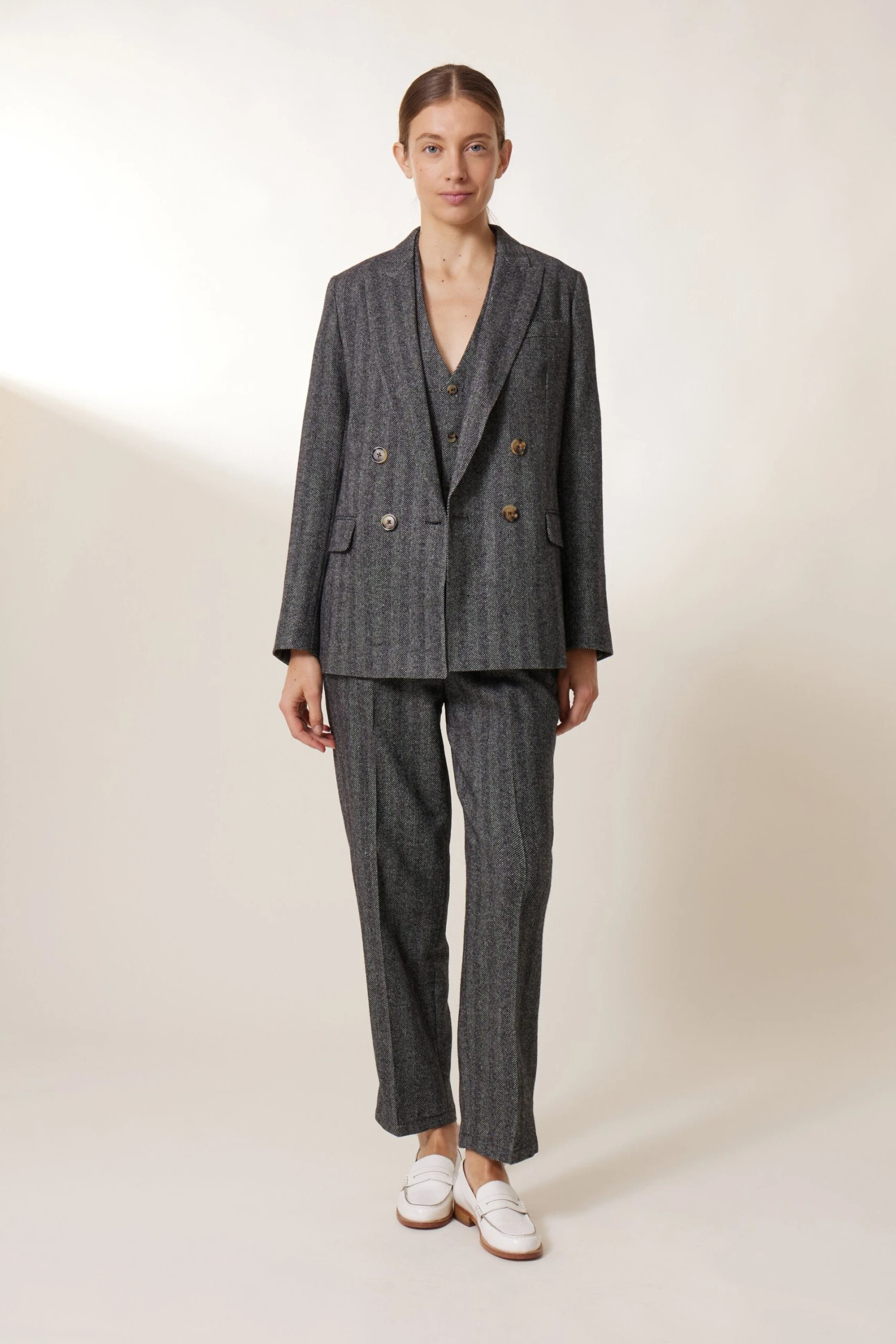 Intemporel et facile à porter, la veste croisée à chevrons est la pièce élégante et confortable de la saison.